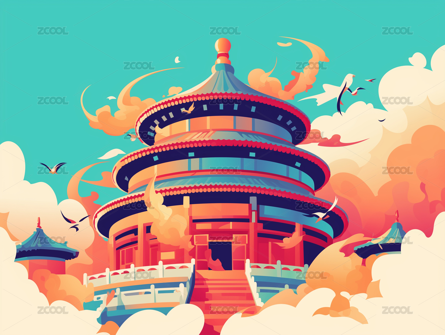 国庆节假期放假游玩插画中国风天坛建筑海报