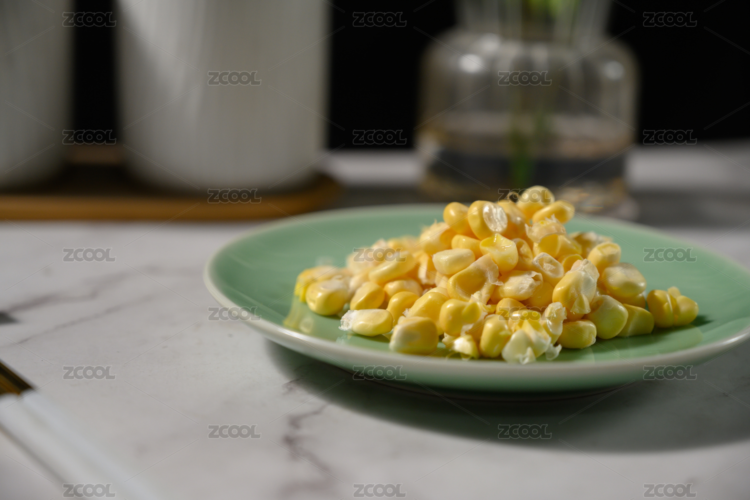 桌面上的盘子里的美味可口的玉米粒