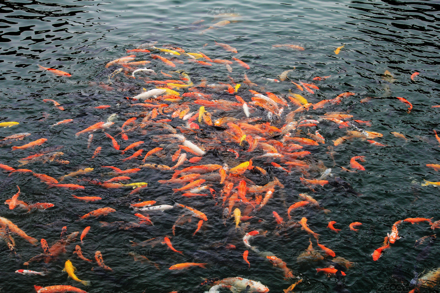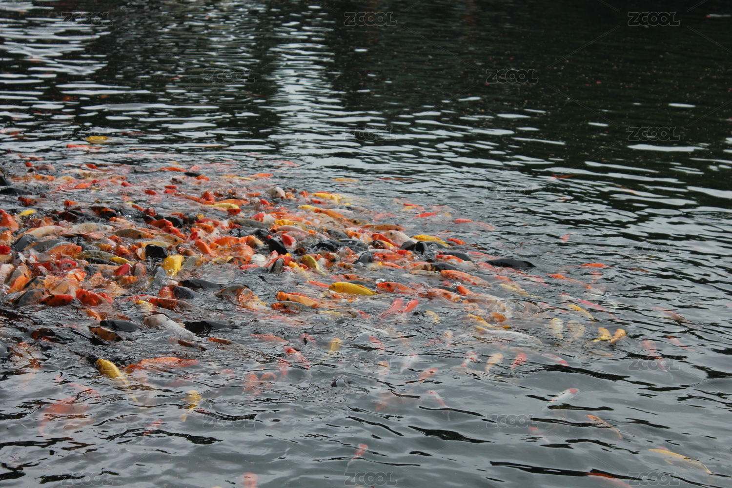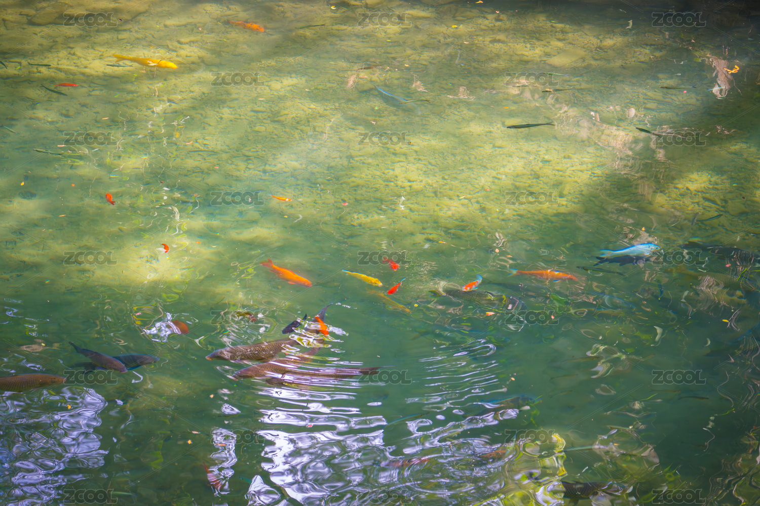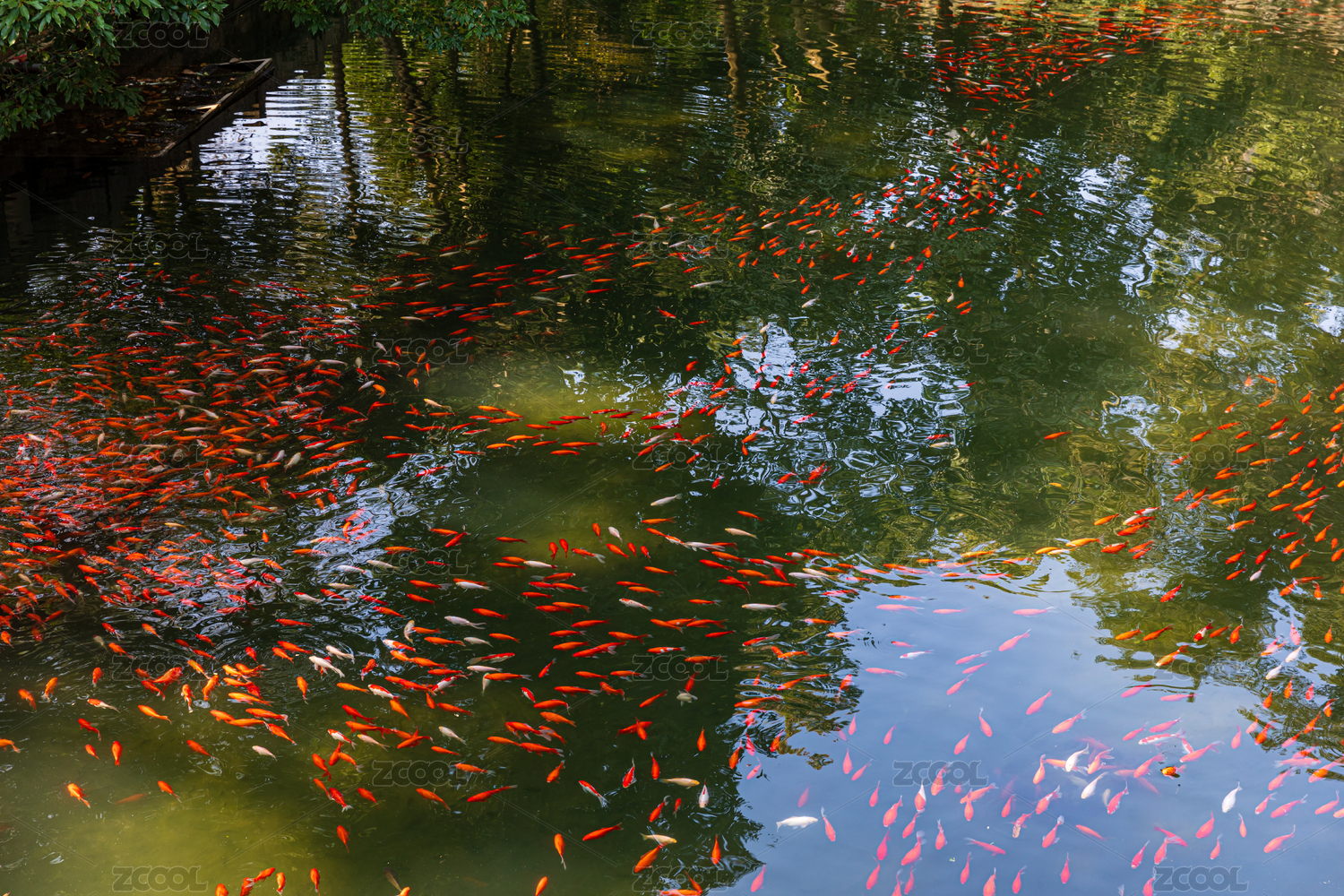 中国江苏苏州园林阴雨天池塘里游动的鱼儿
