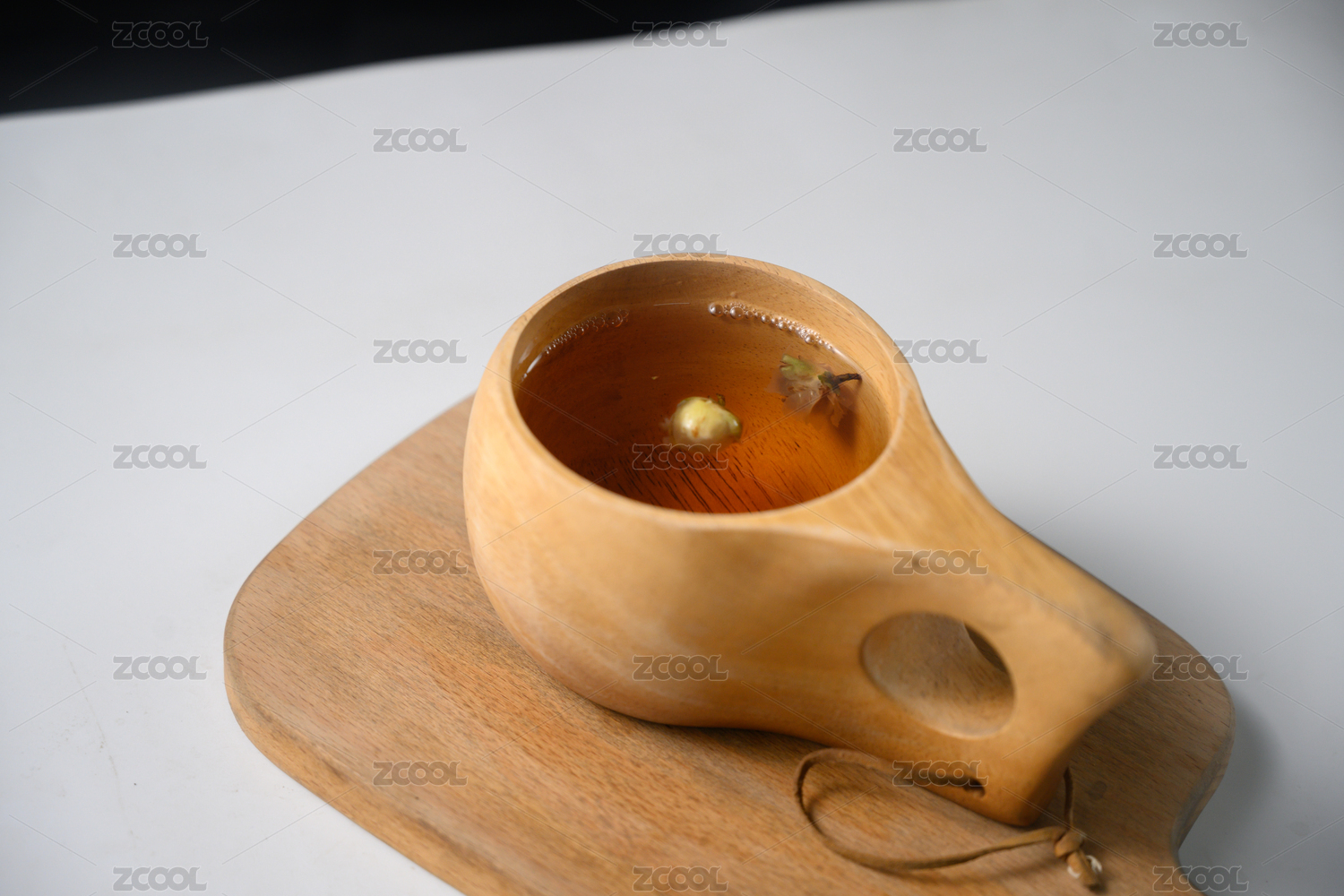 桌面上的杯子里的甘甜可口的金盏菊花茶