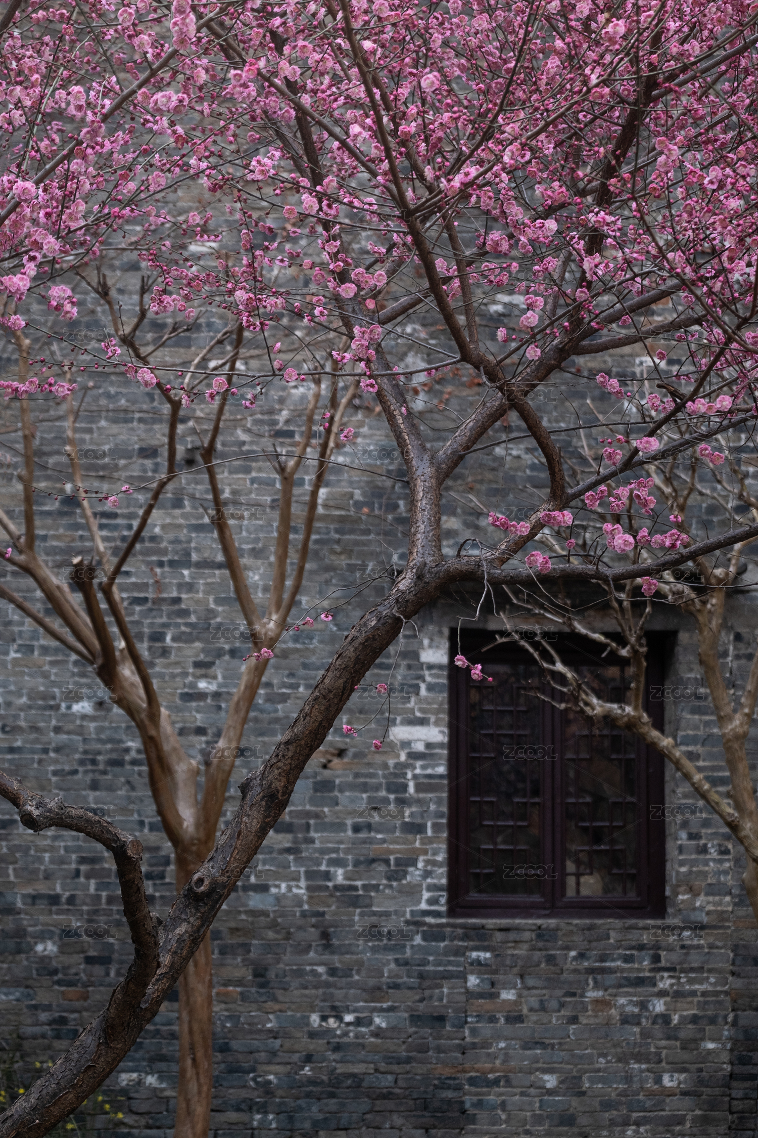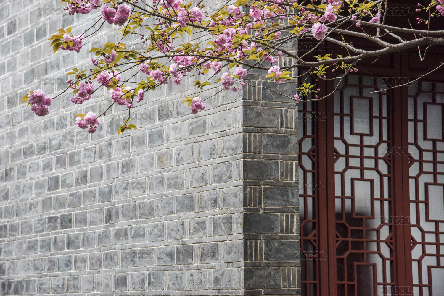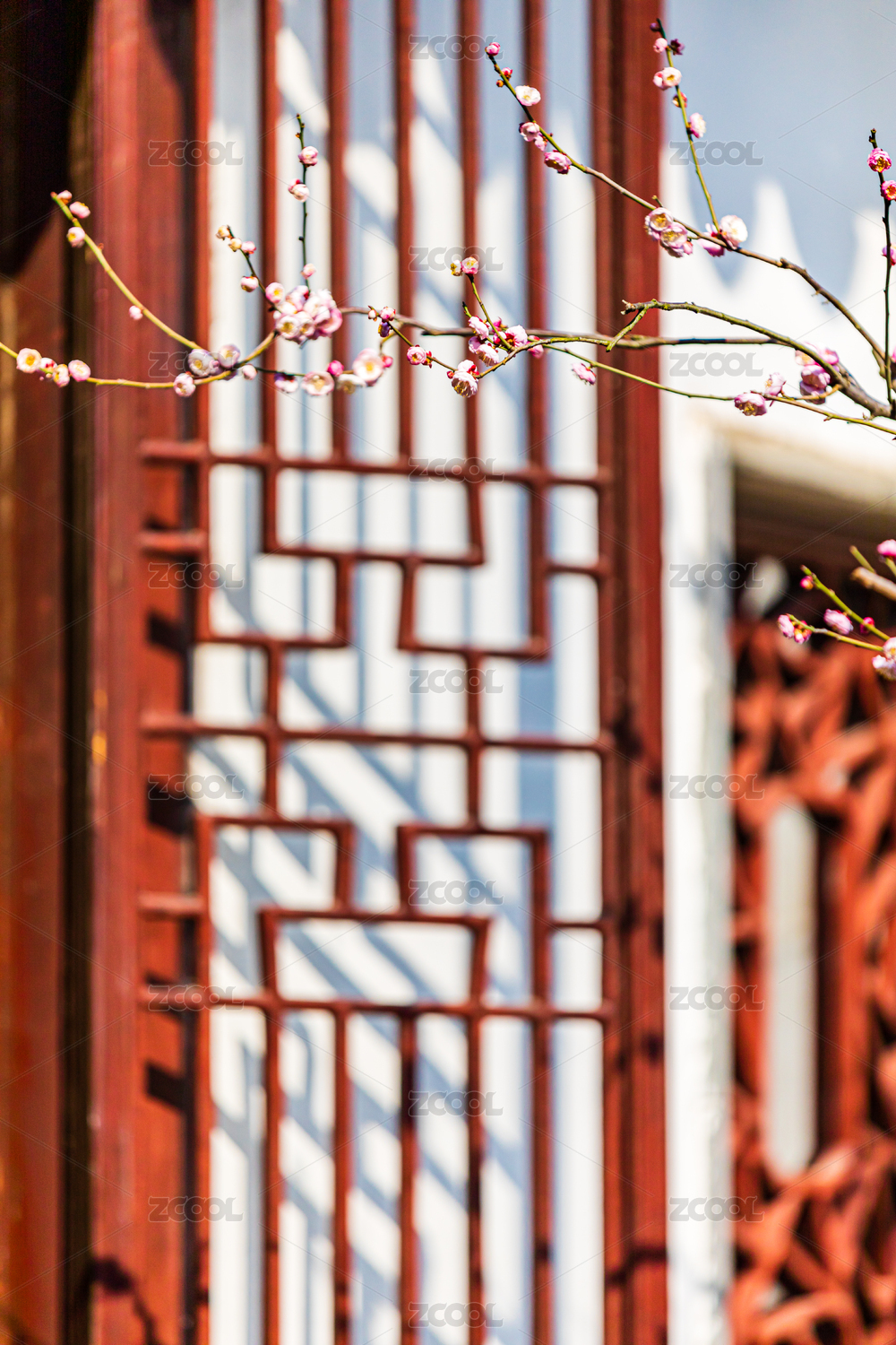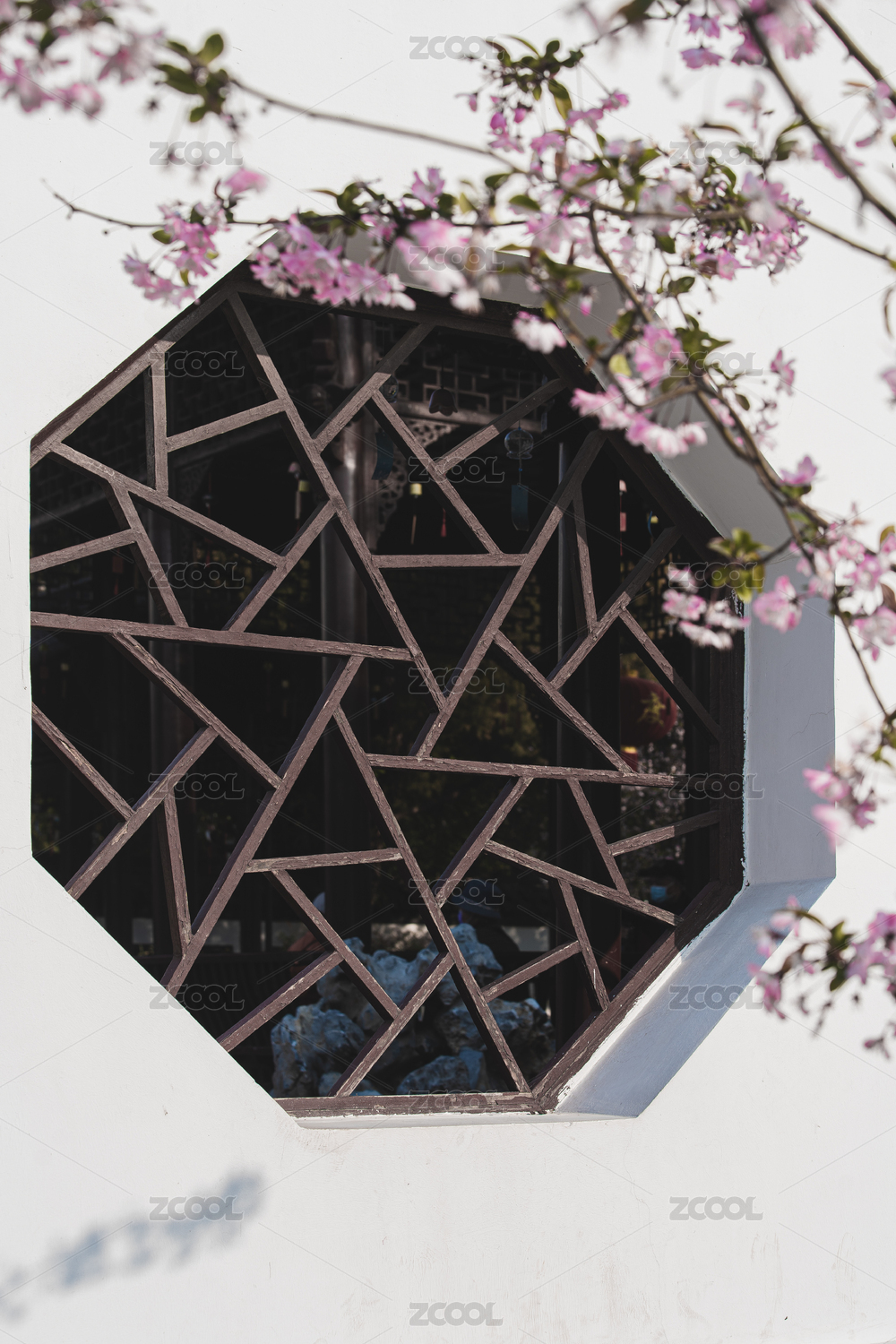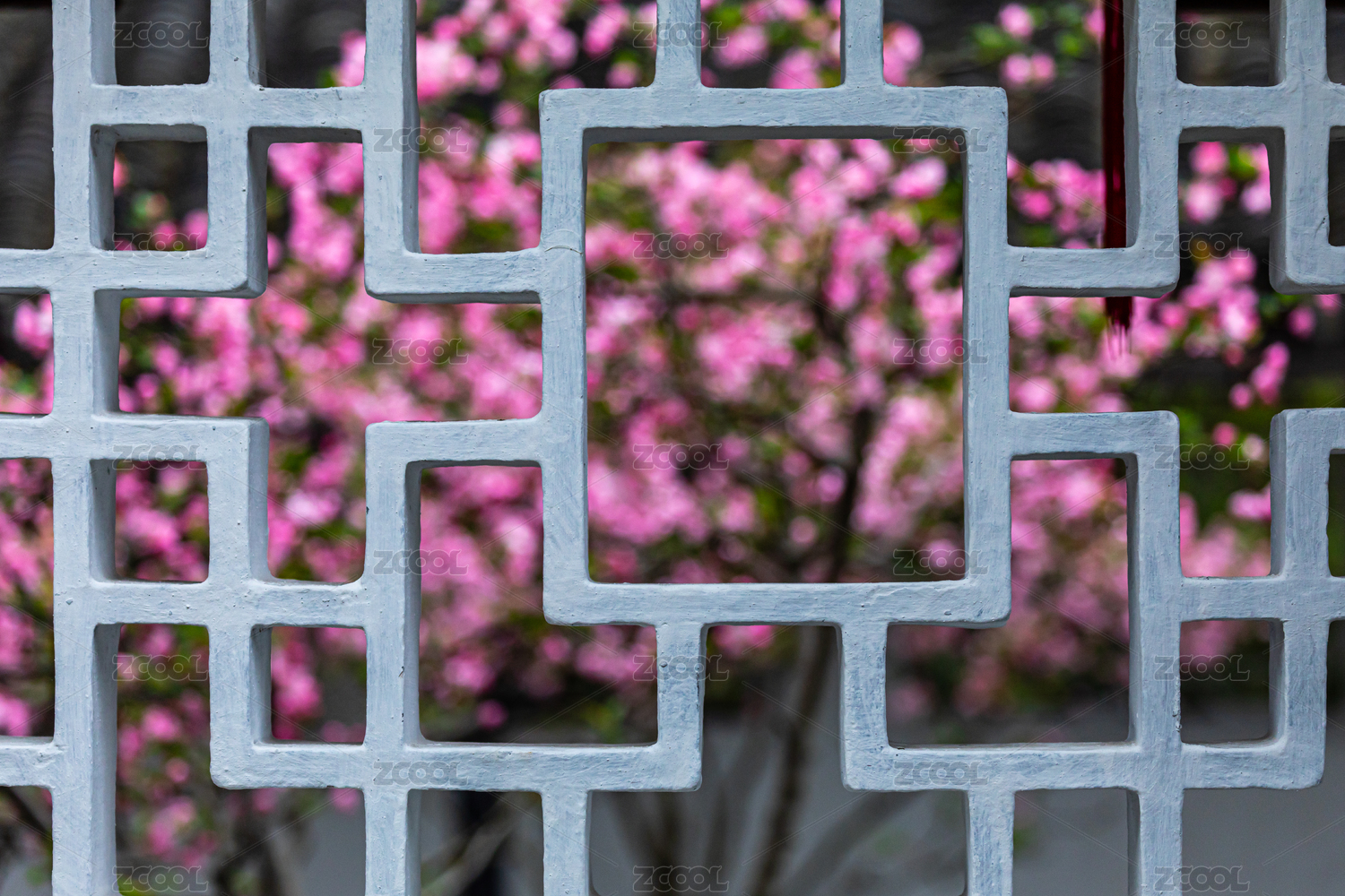 中式花窗与粉花