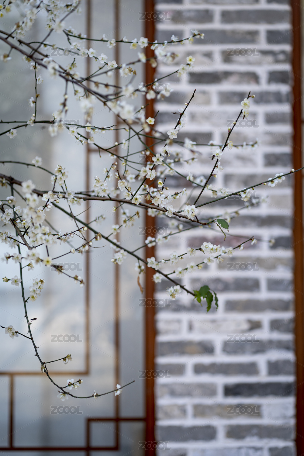 古色古香的窗棂前盛开的白色梅花,福建上杭