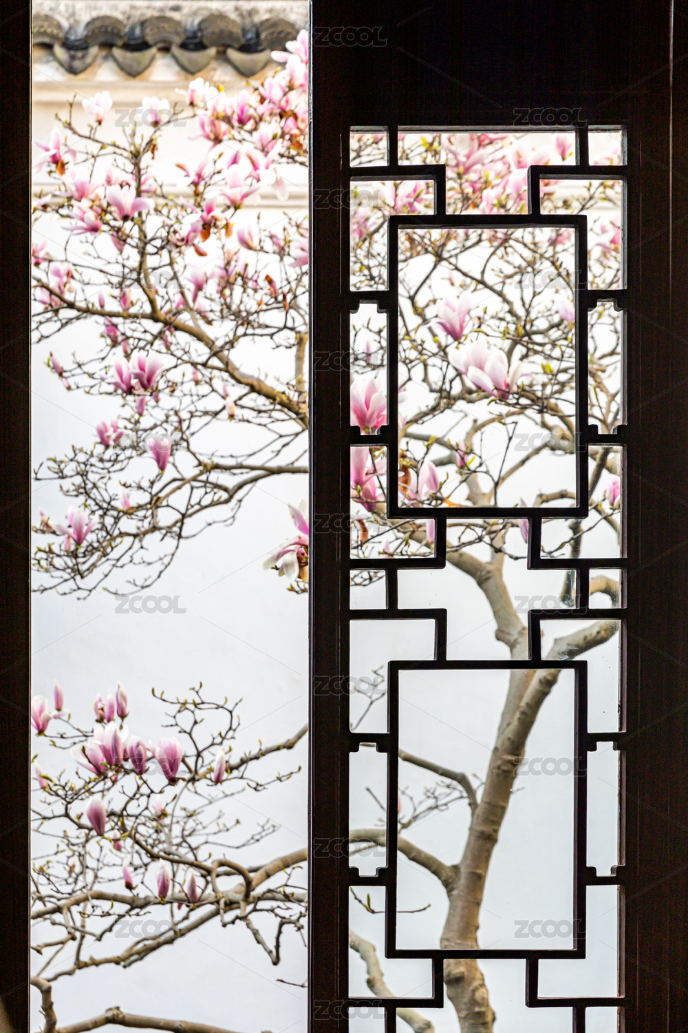 古典园林窗外盛开的玉兰花