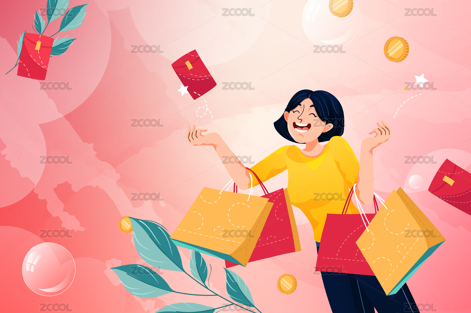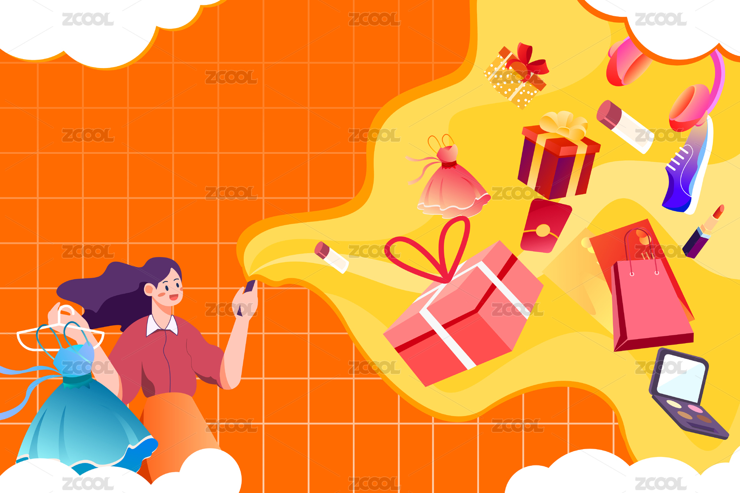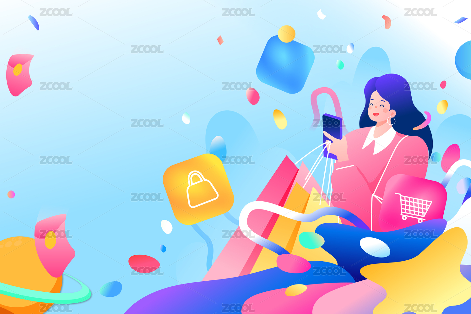 一位美丽时尚的都市少女用手机在网上购物消费的插画背景