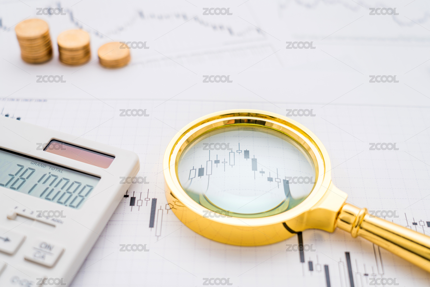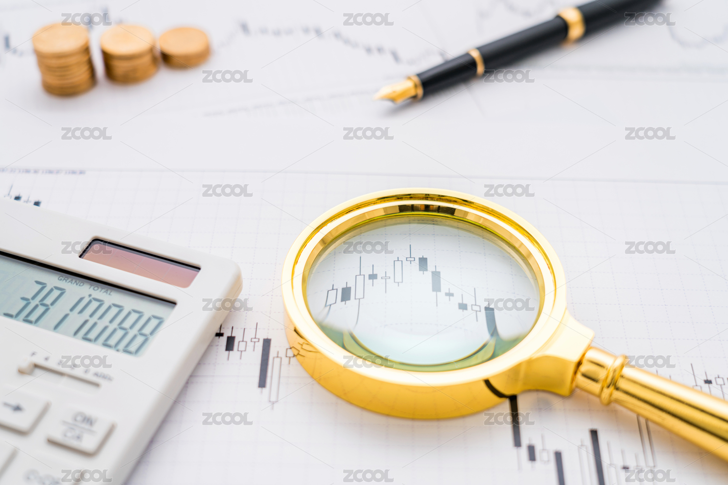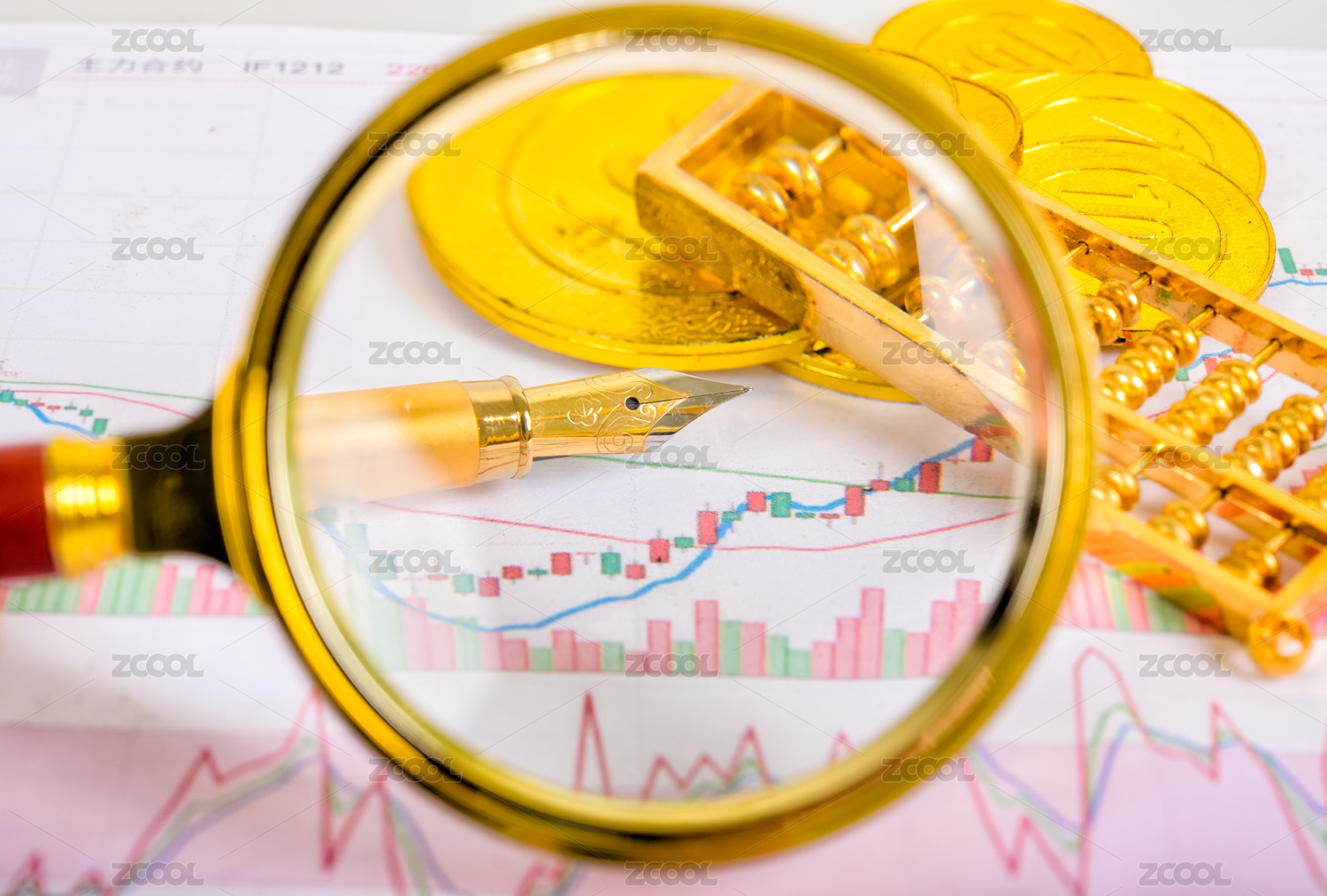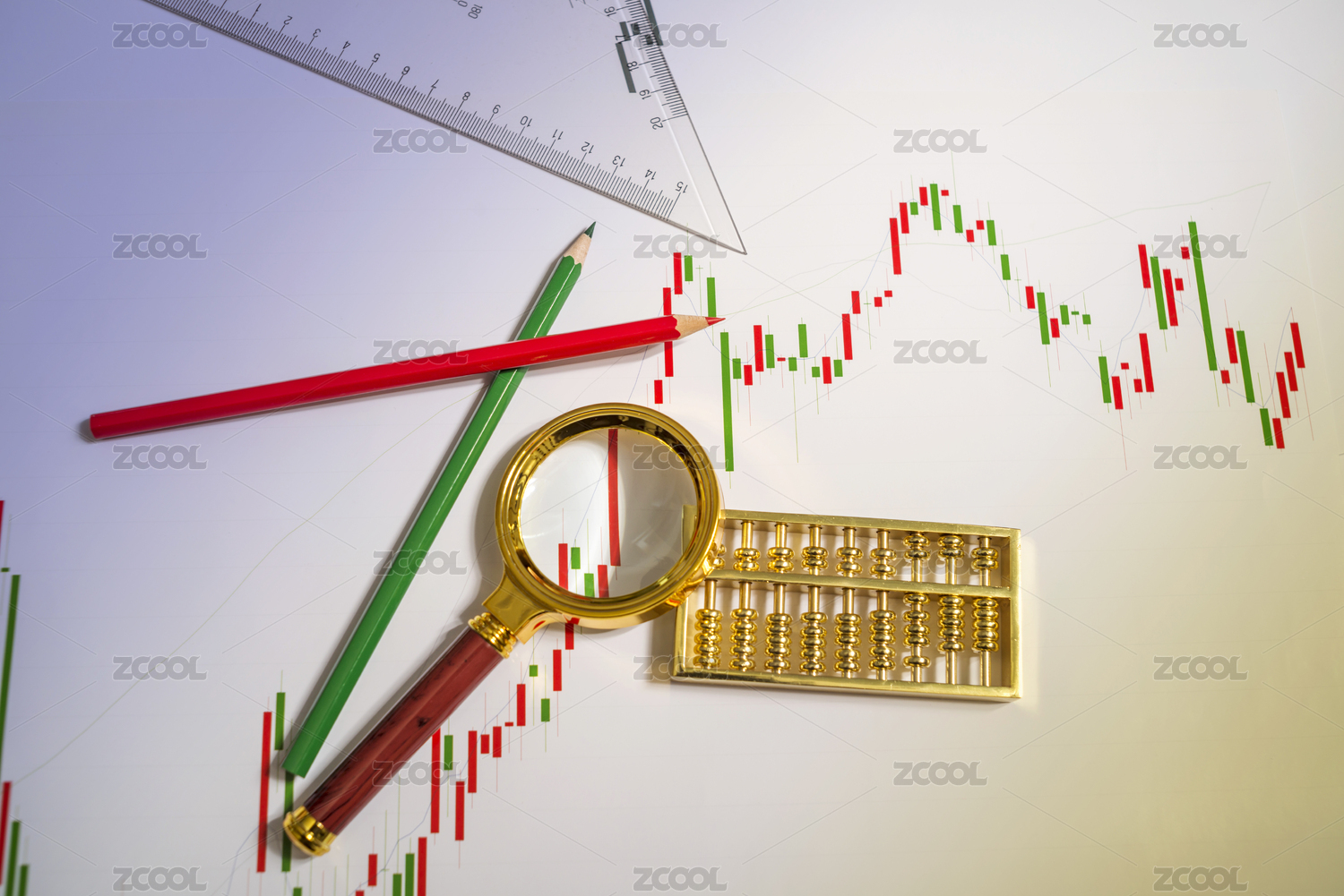 K线图上的金色算盘和放K线大镜和两支铅笔