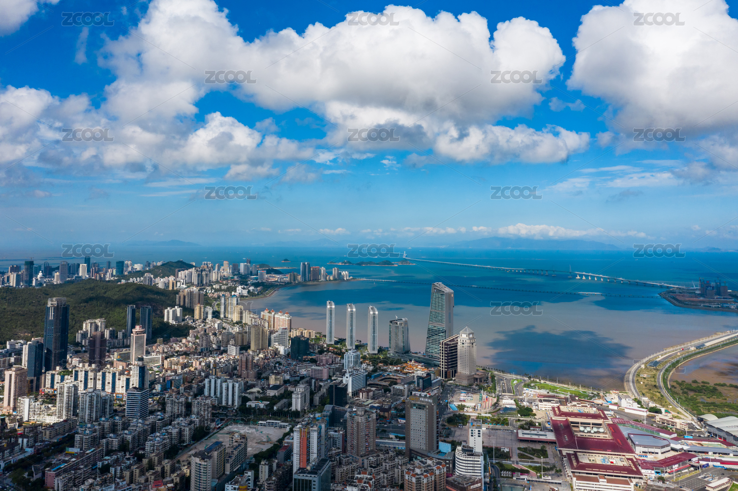 中国广东省珠海市拱北天际线城市风光日落航拍