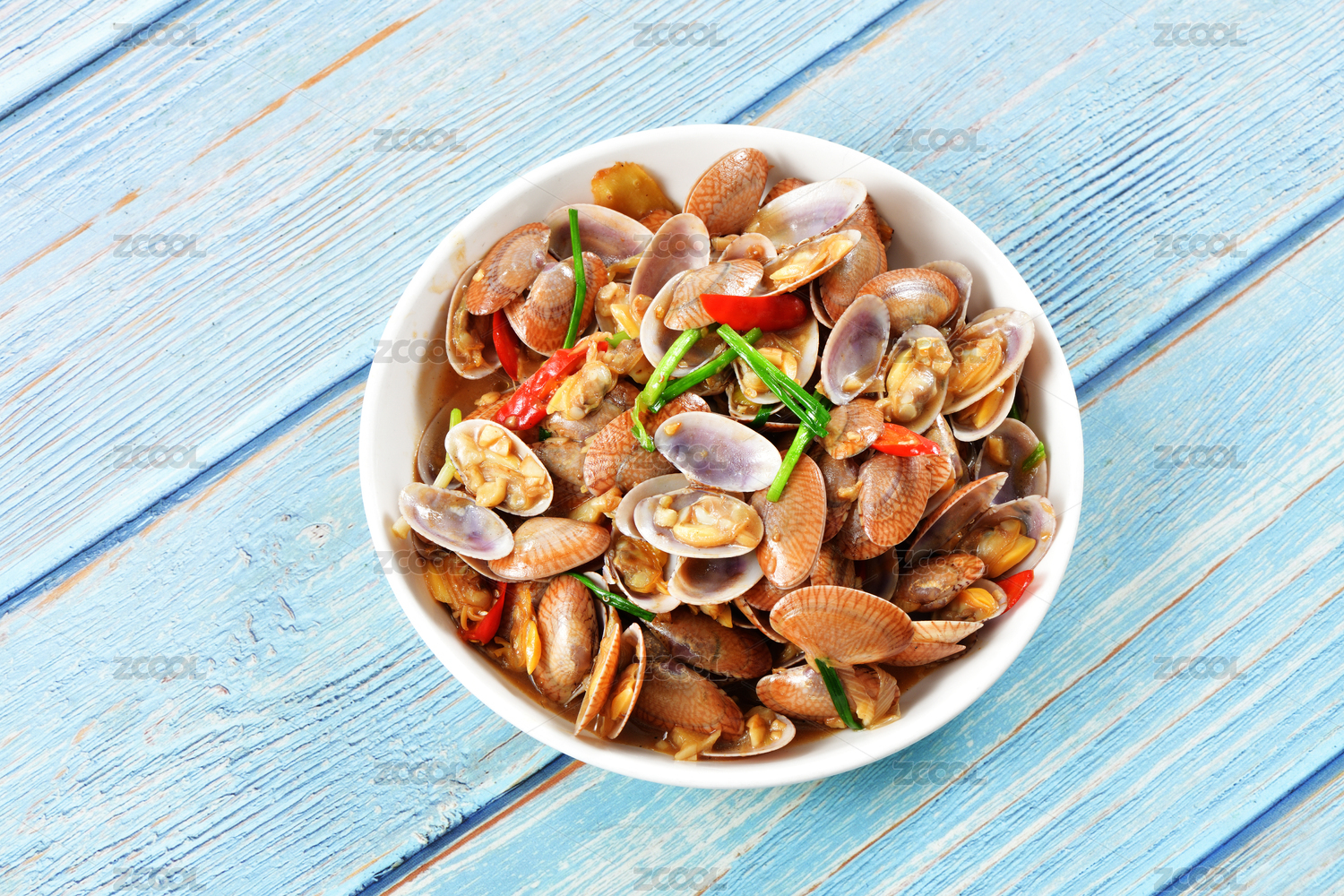 木桌背景一盘爆炒花蛤