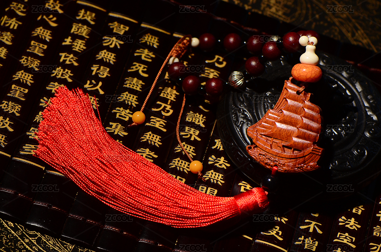 心经竹简背景上的貔貅桃木汽车挂件