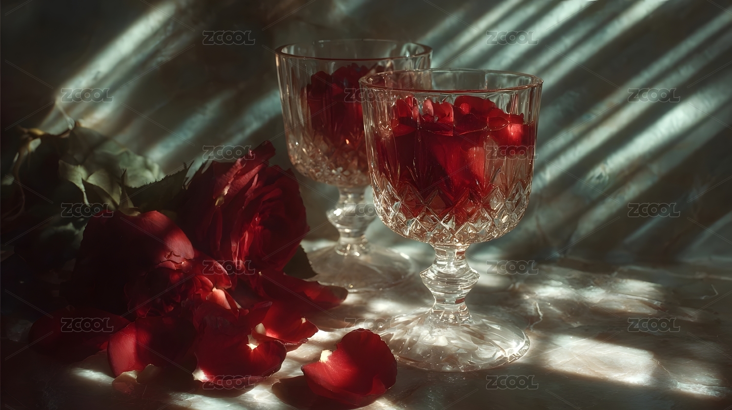 红酒杯中玫瑰花瓣