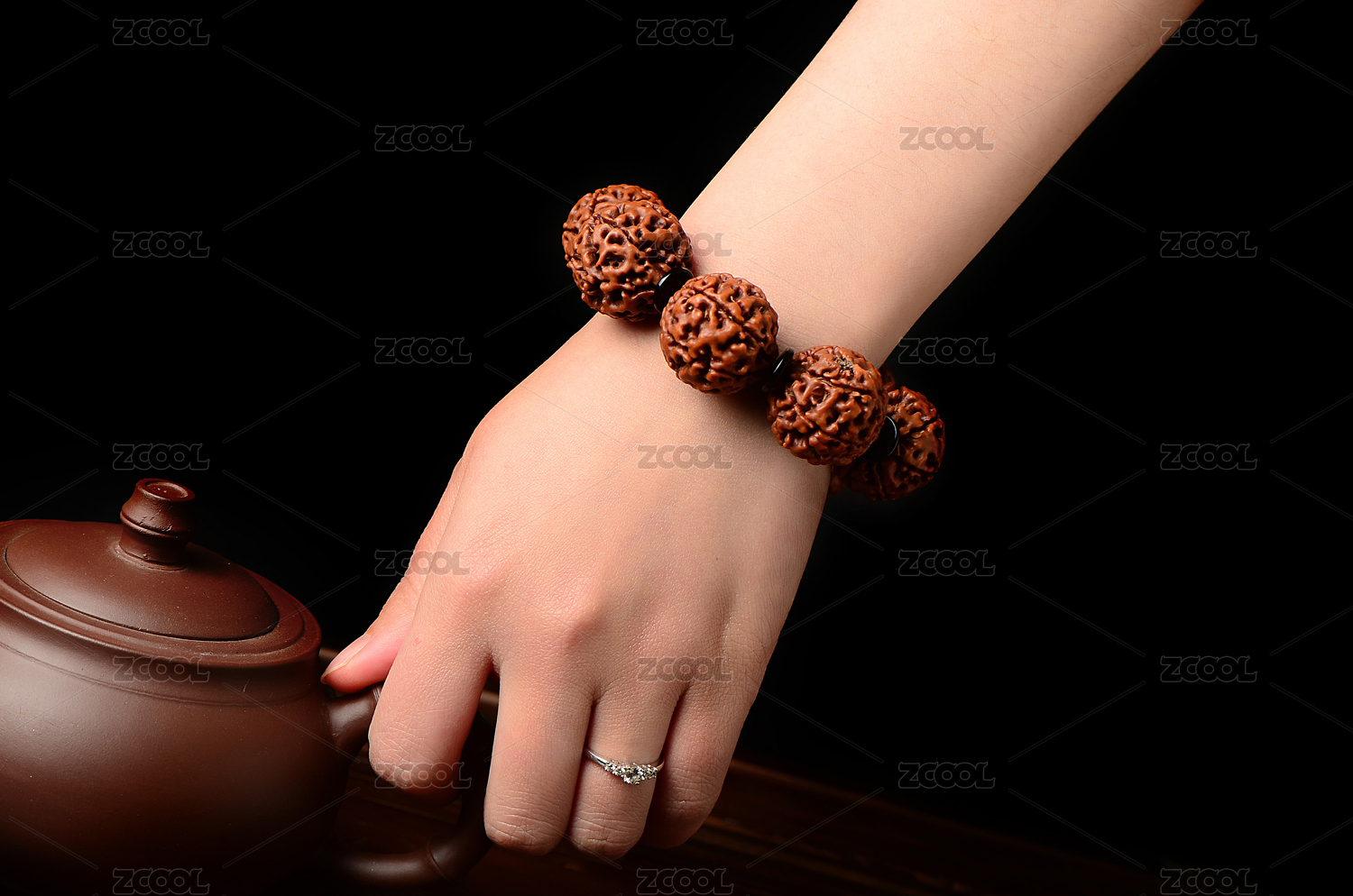 复古风格背景上的佛螺菩提子佛珠手串佩戴图