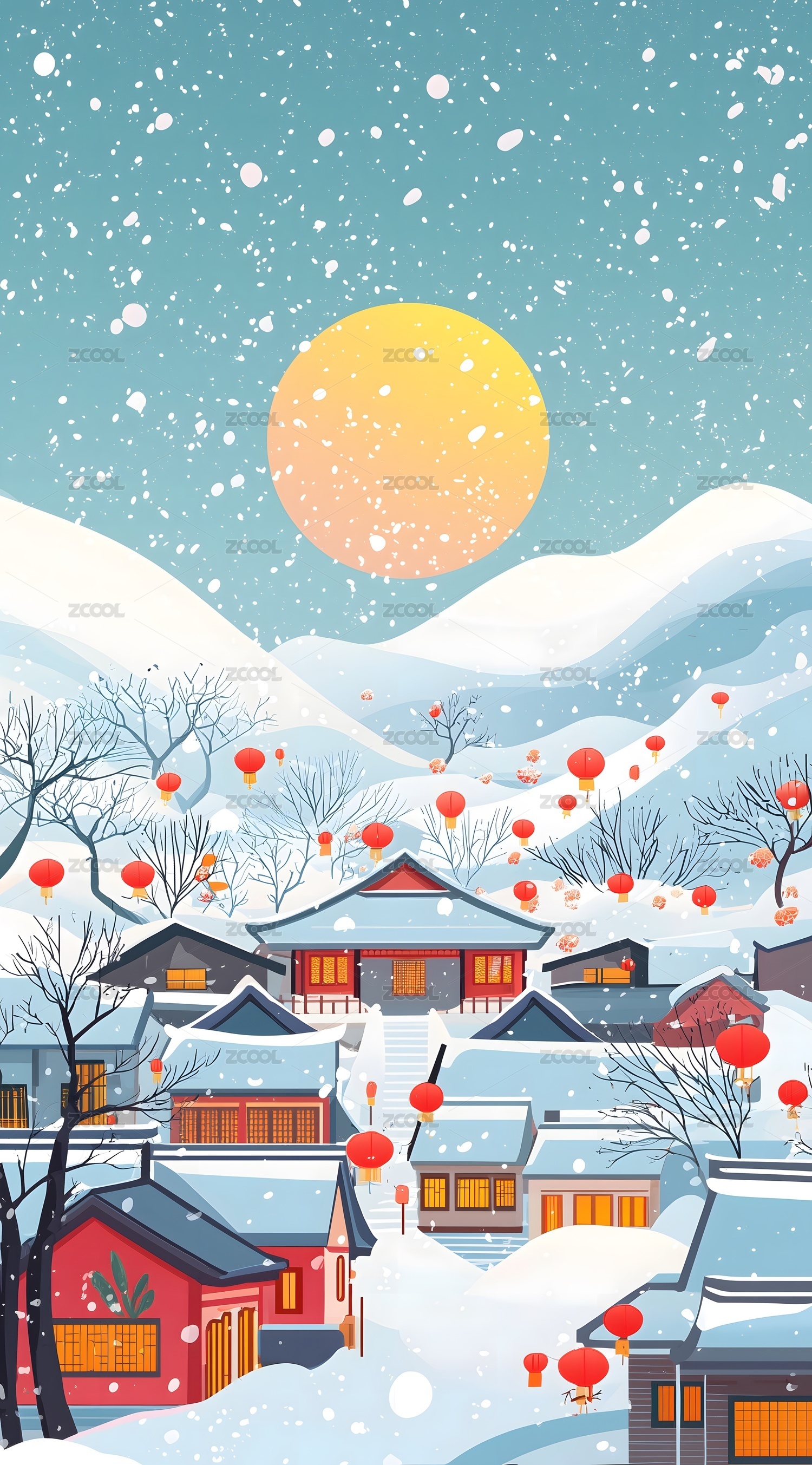 大雪中的小镇节气风景插画