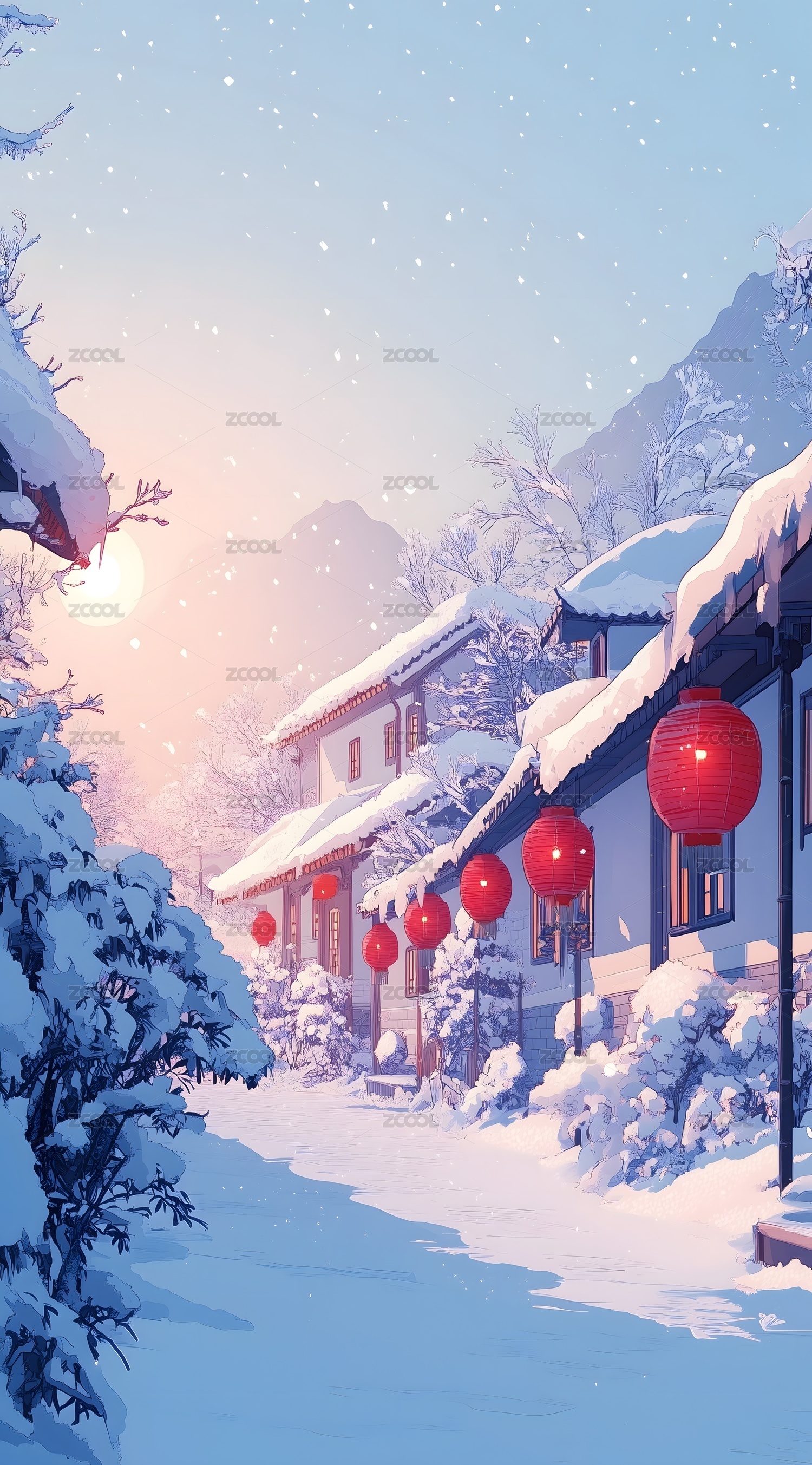 雪夜红灯笼下的木屋