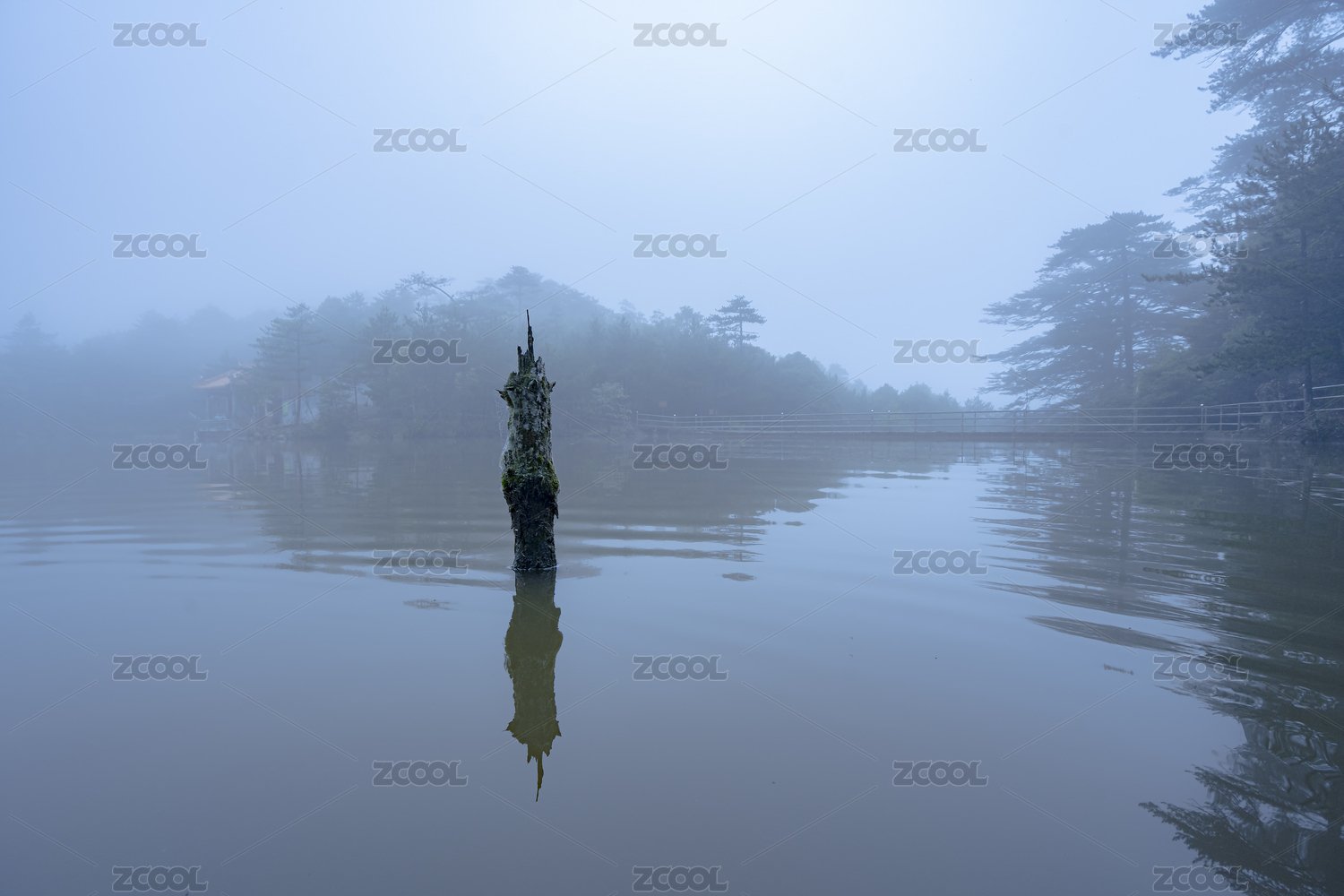 大雾中的四川瓦屋山山顶高山湖泊和森林风景