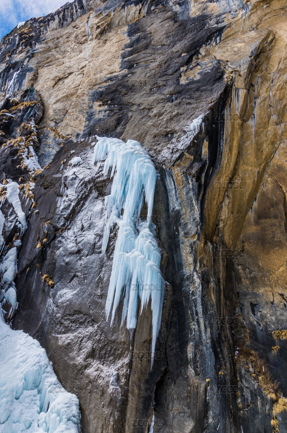 高山瀑布下凝结的冰