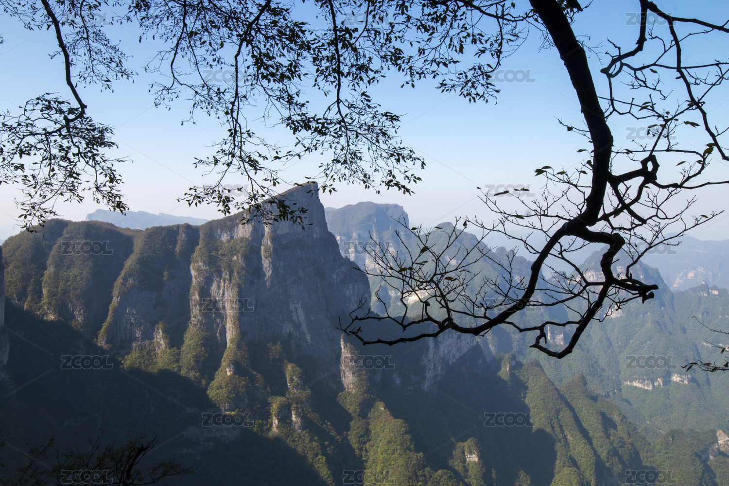 秋日蓝天下的中国湖南张家界天门山景区连绵起伏雄伟的崇山峻岭