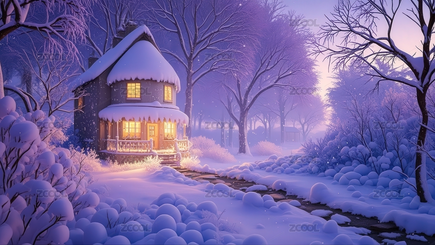 冬日雪景小屋温暖灯光