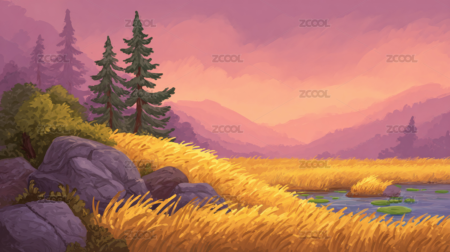 梦幻山间河流风景插画