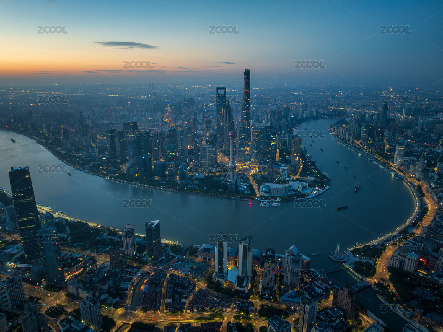 航拍日落时的中国上海市中心黄浦江沿岸风光
