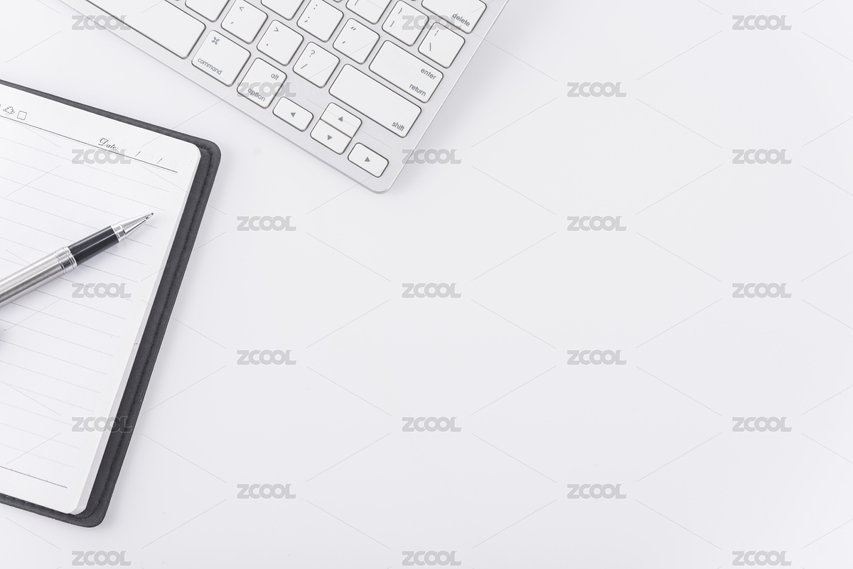 办公桌上空白的笔记本电脑、日记本、笔和一杯咖啡