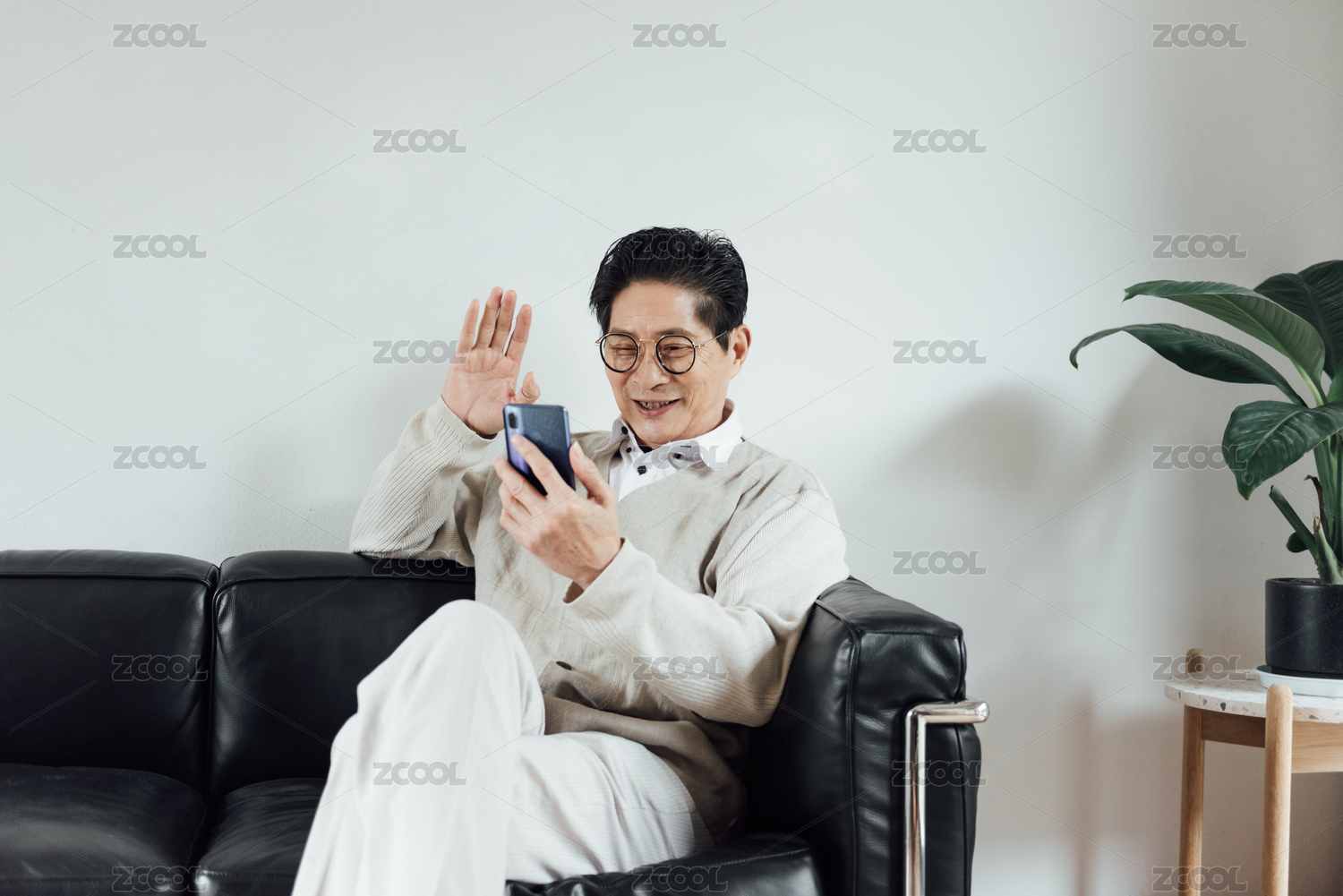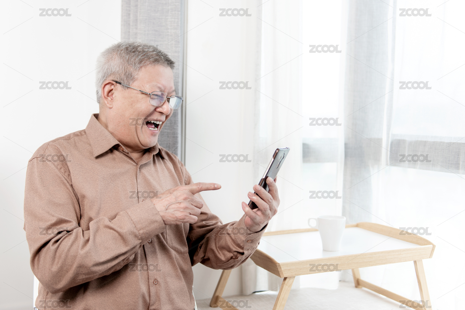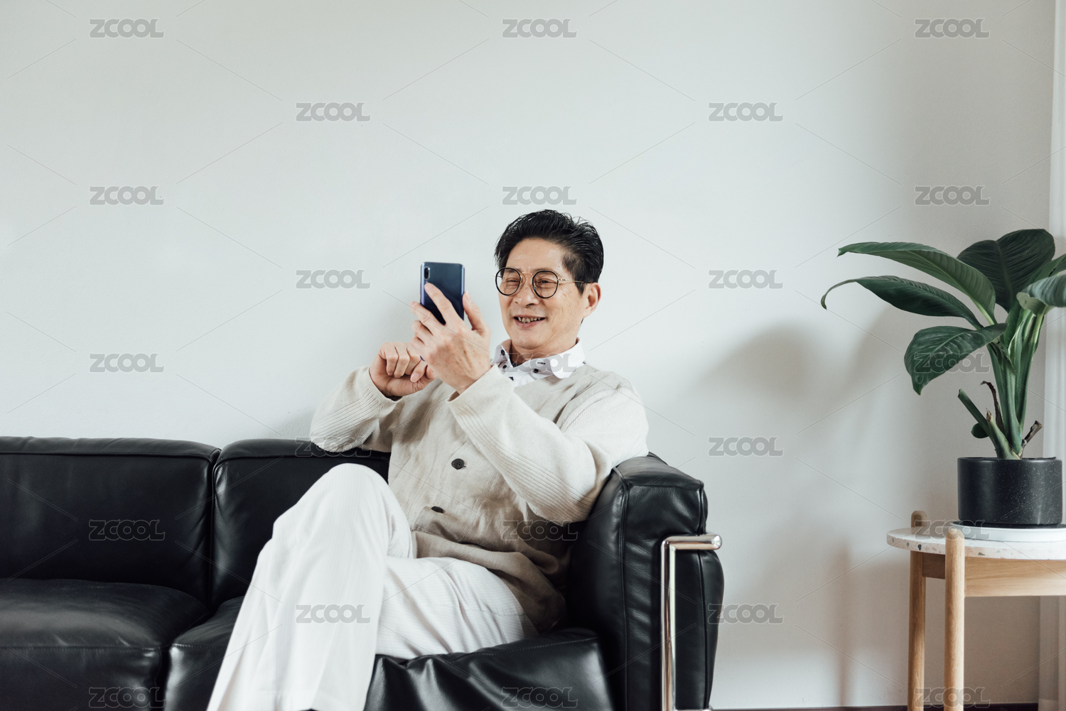 一位亚洲老年男人在客厅使用手机