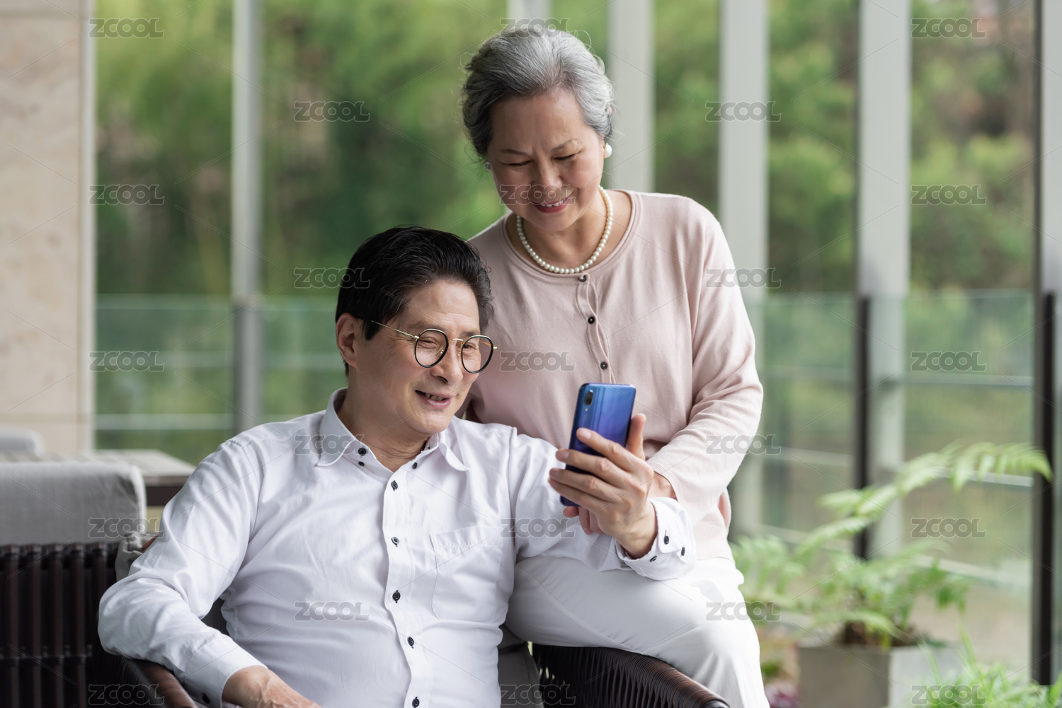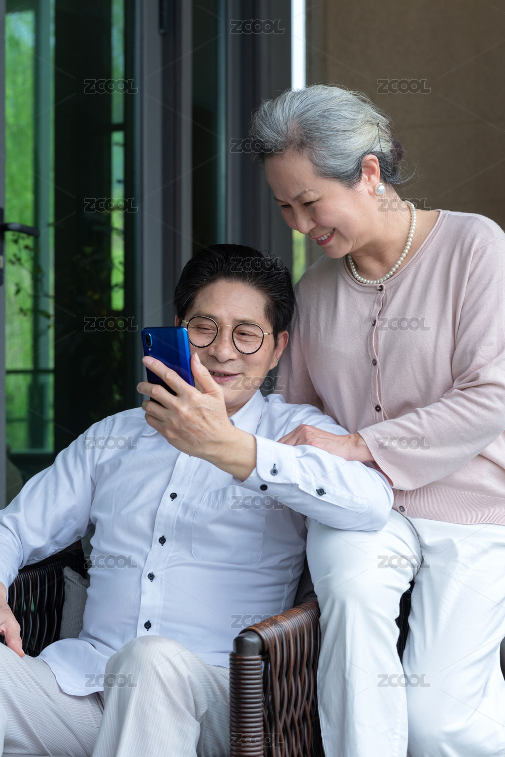 一对使用手机的亚洲老年夫妇