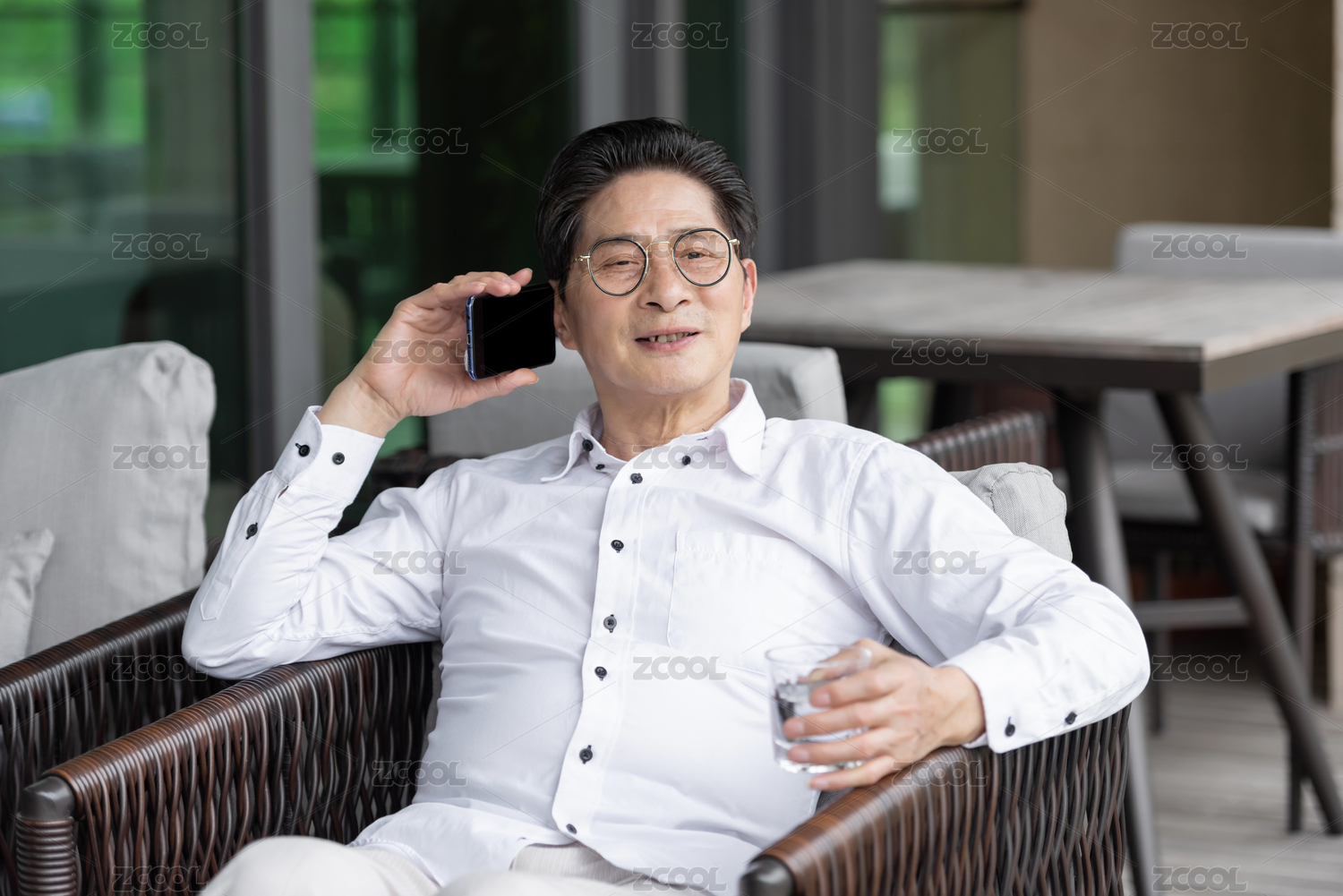 一位亚洲的老年男人坐在户外椅子上