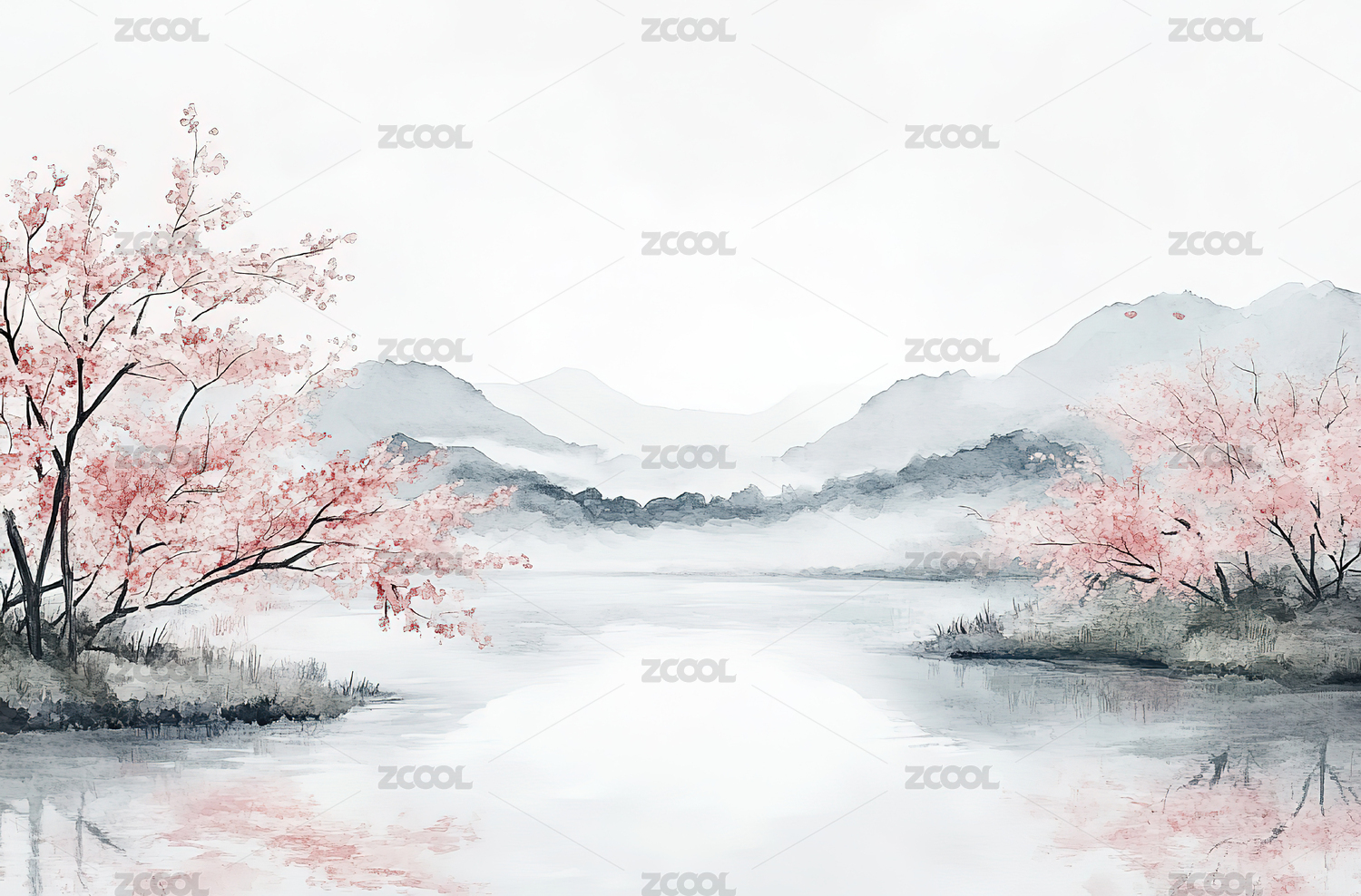 户外梅花高山湖水风景水墨插画