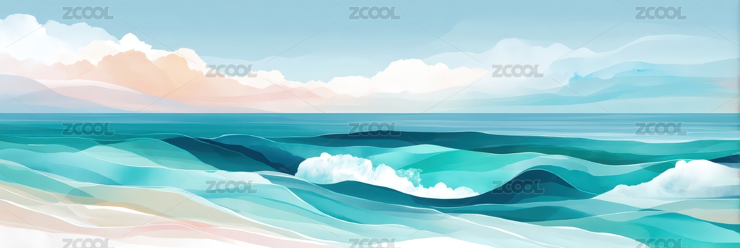 蓝色大海和沙滩上的遮阳伞,创意艺术插画