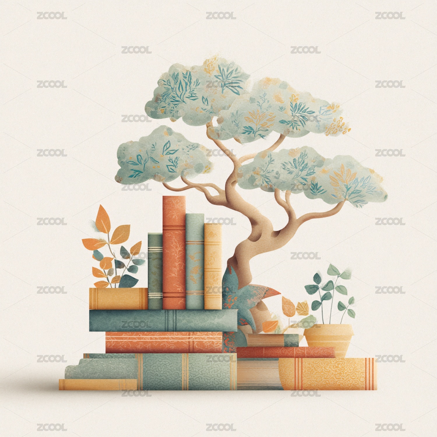 书籍与树的梦幻插画场景