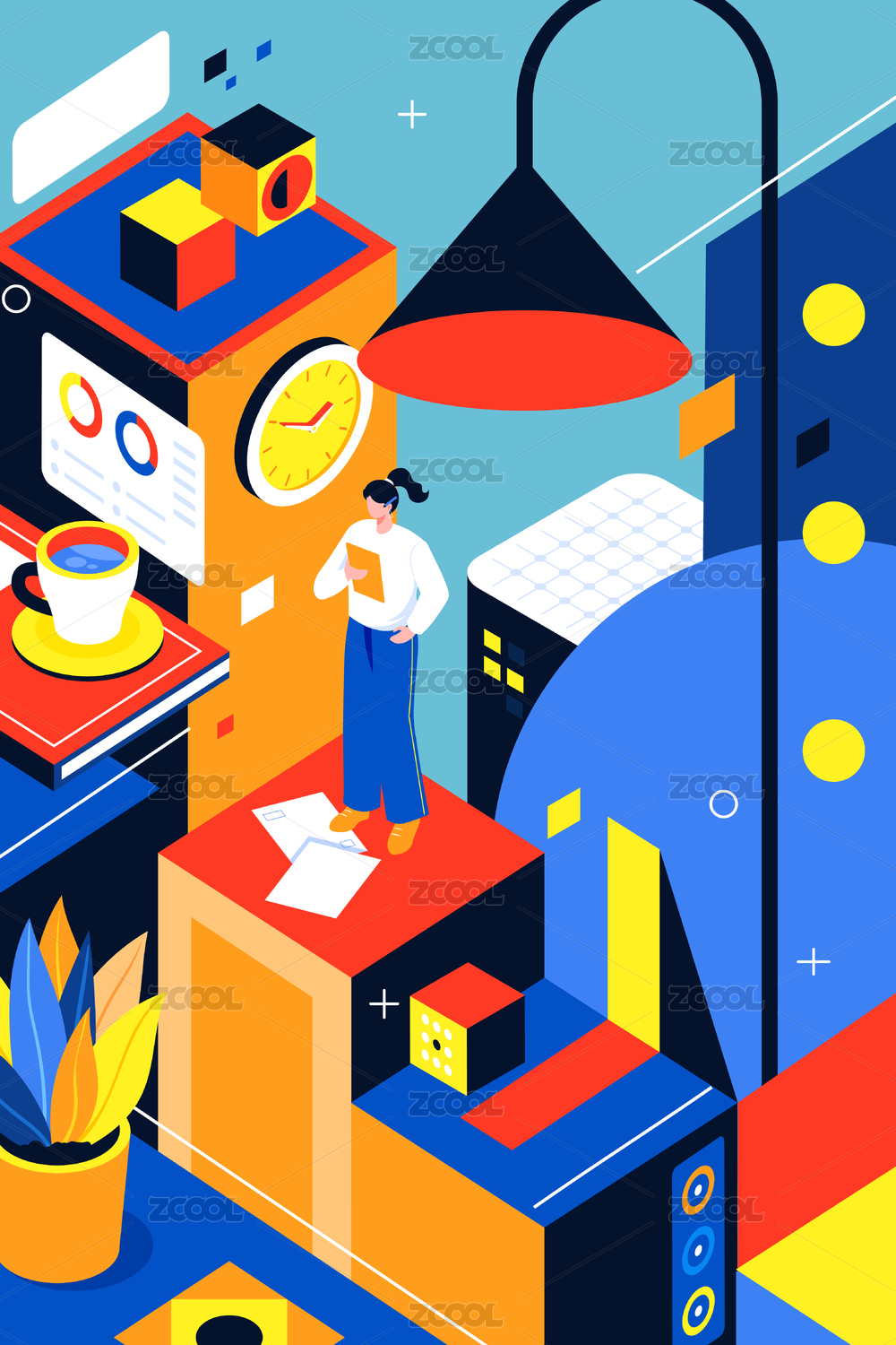 商务办公和绘画工具组成的奇幻插画