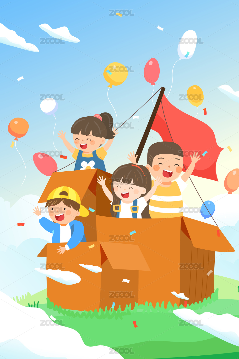 六一儿童节小孩玩气球插画快乐童年活动海报