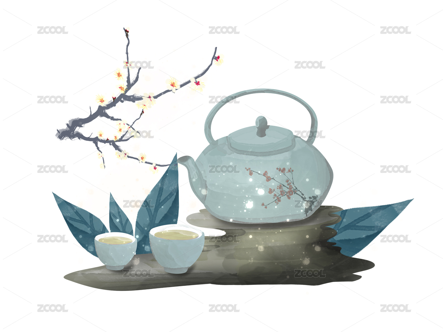 复古茶壶茶杯石头梅花水墨古风茶文化元