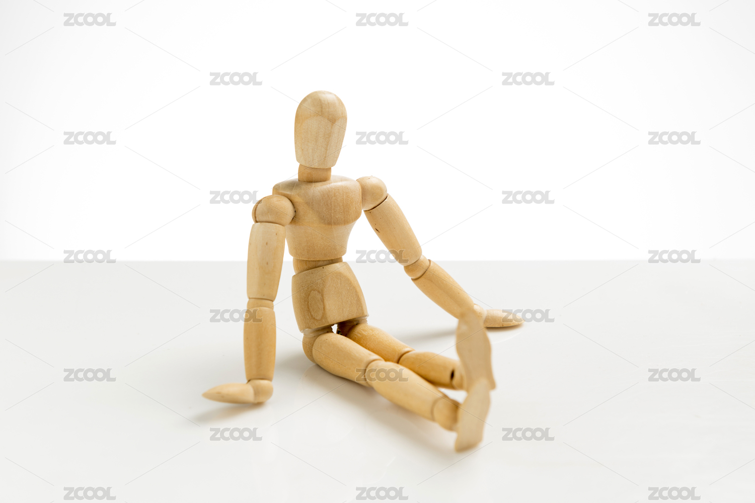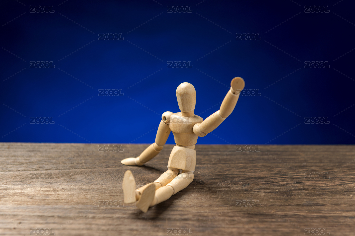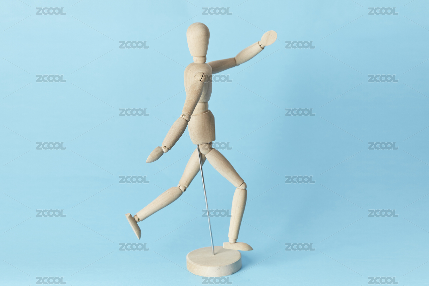 做出各种姿势的木人偶摆放在桌面上蓝色背景