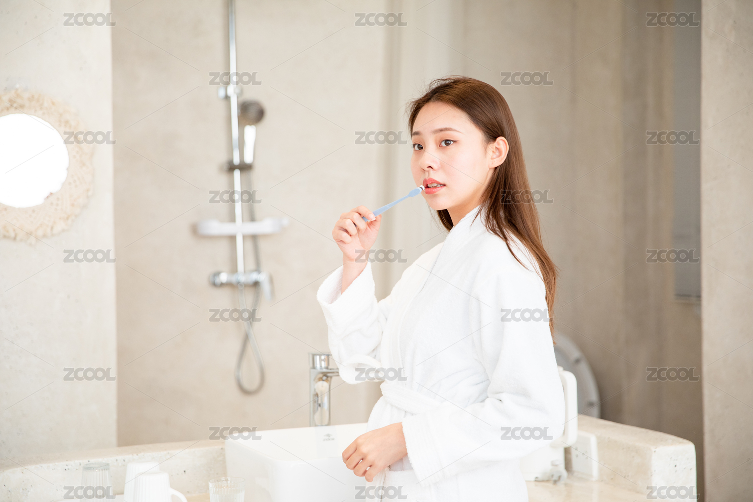 年轻女性穿着浴袍拿着牙刷准备刷牙