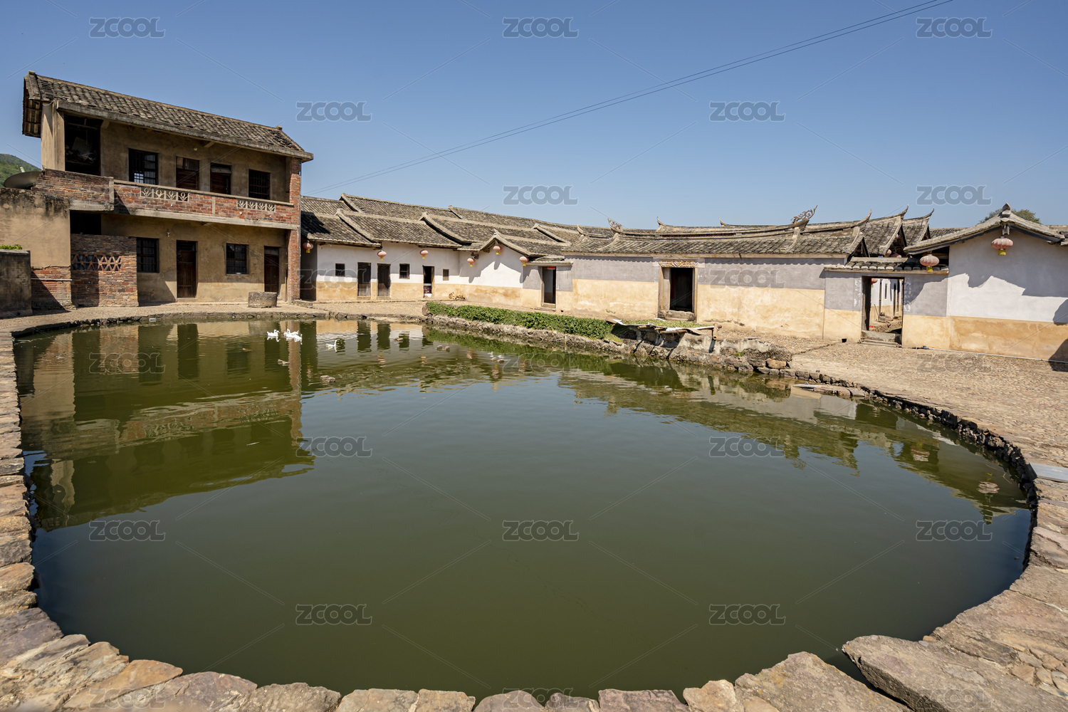 上杭客家围屋正面池塘及鹅卵石地面,中国