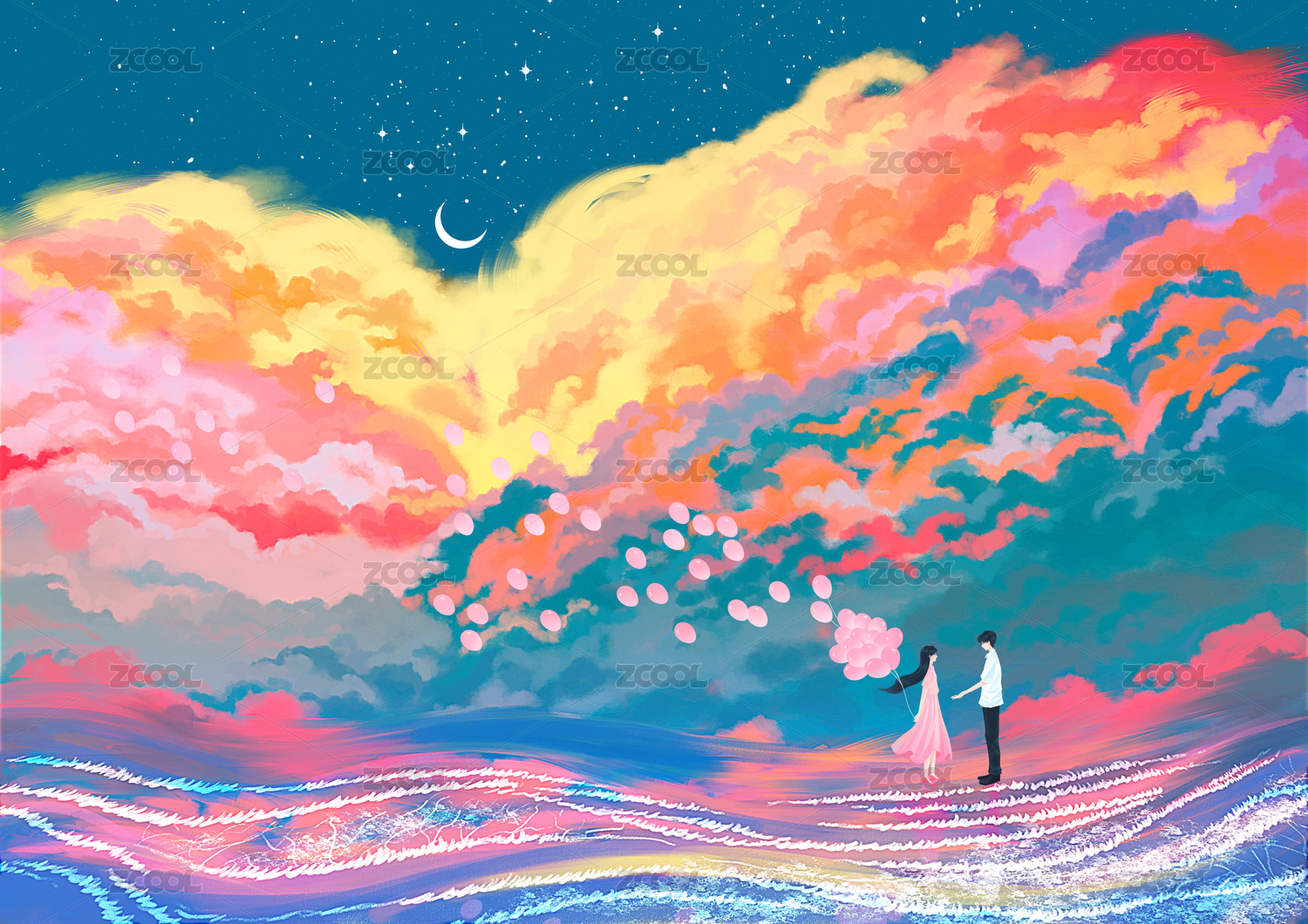 海边牵手的情侣剪影与发光的月亮唯美插画