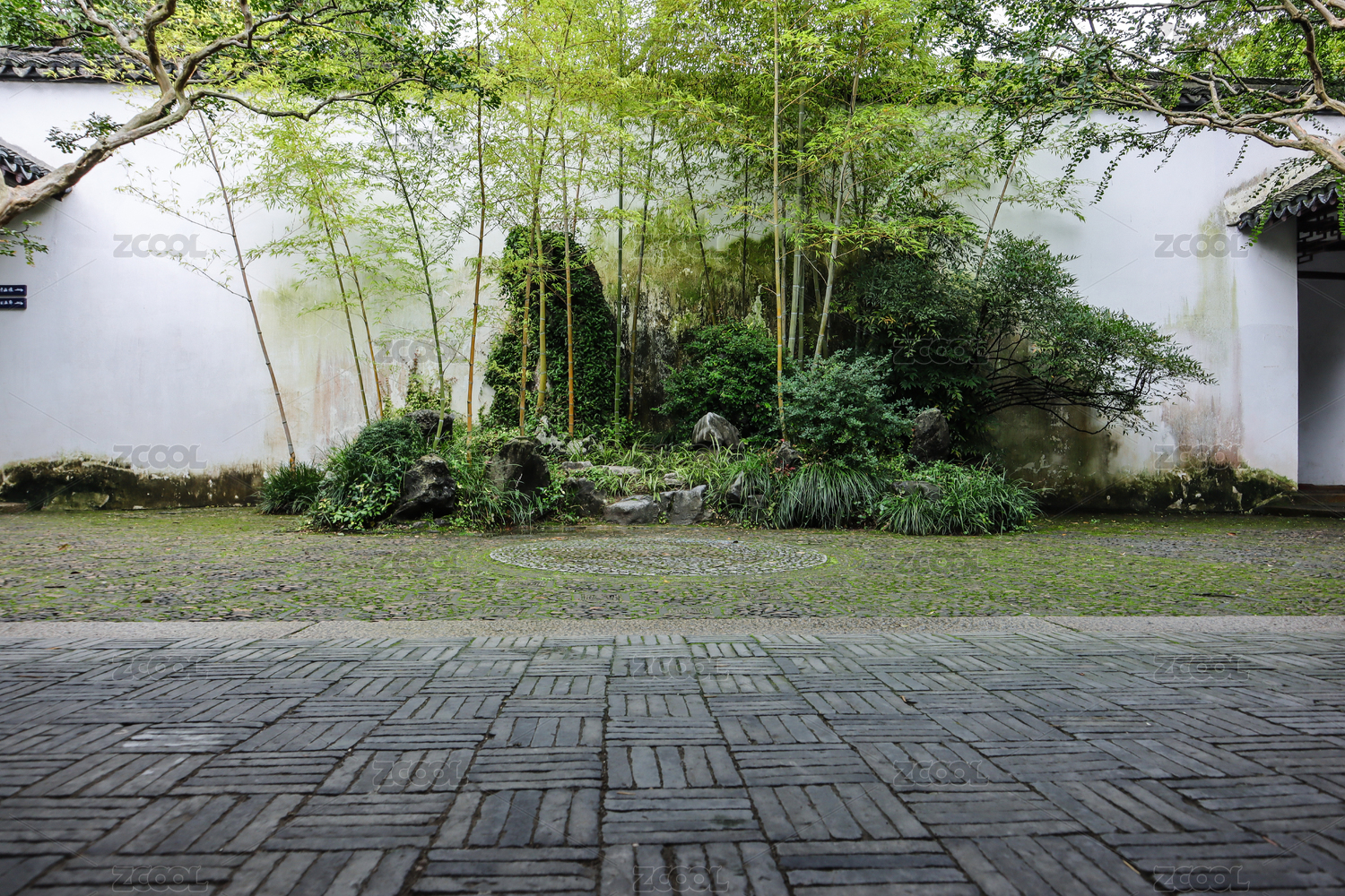 中国苏州园林的月洞门与绿树