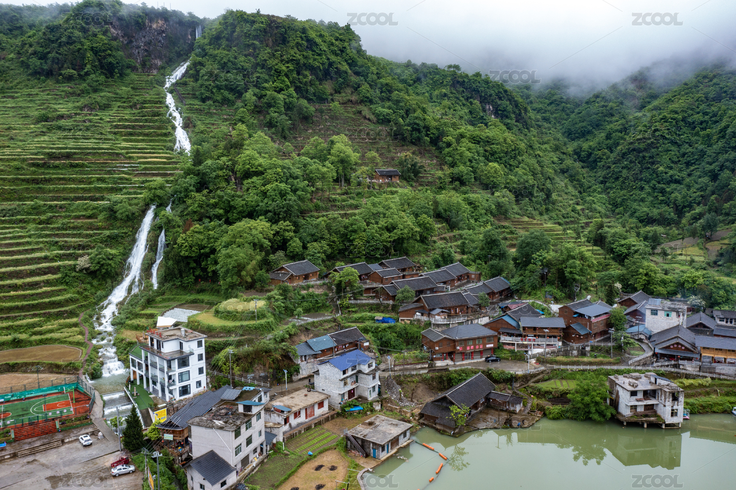 响水洞,响水苗寨,铜仁,松桃,梯田,苗寨,航拍,村落,瀑布,云雾