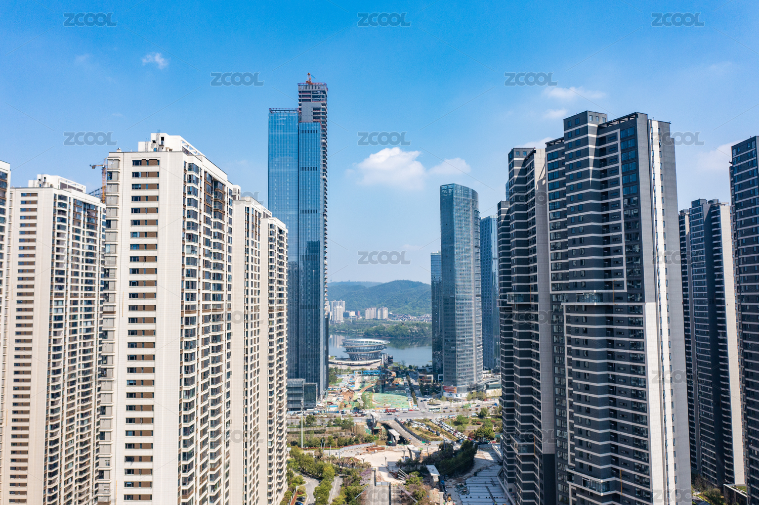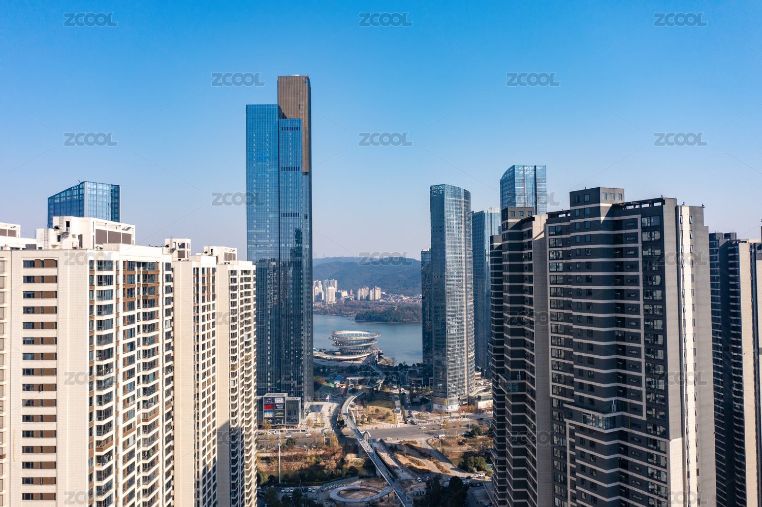 梅溪湖,长沙,城市,航拍,玻璃幕墙,高楼,房地产,梅溪湖城市岛,水面,蓝天