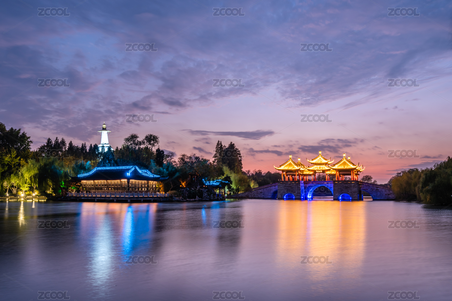 中国扬州瘦西湖风景的五亭桥古建筑夜景