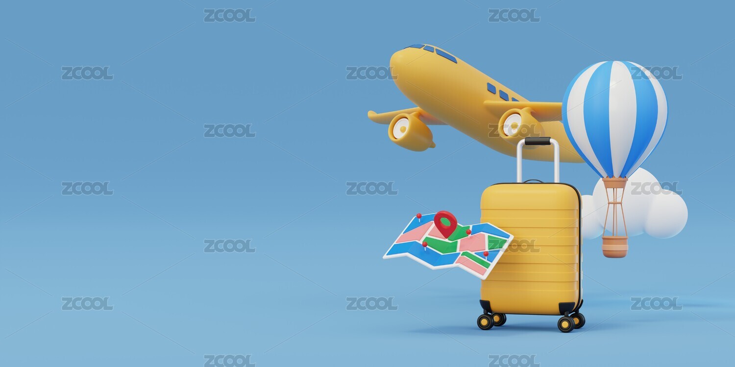 卡通飞机和行李旅游度假场景3D渲染