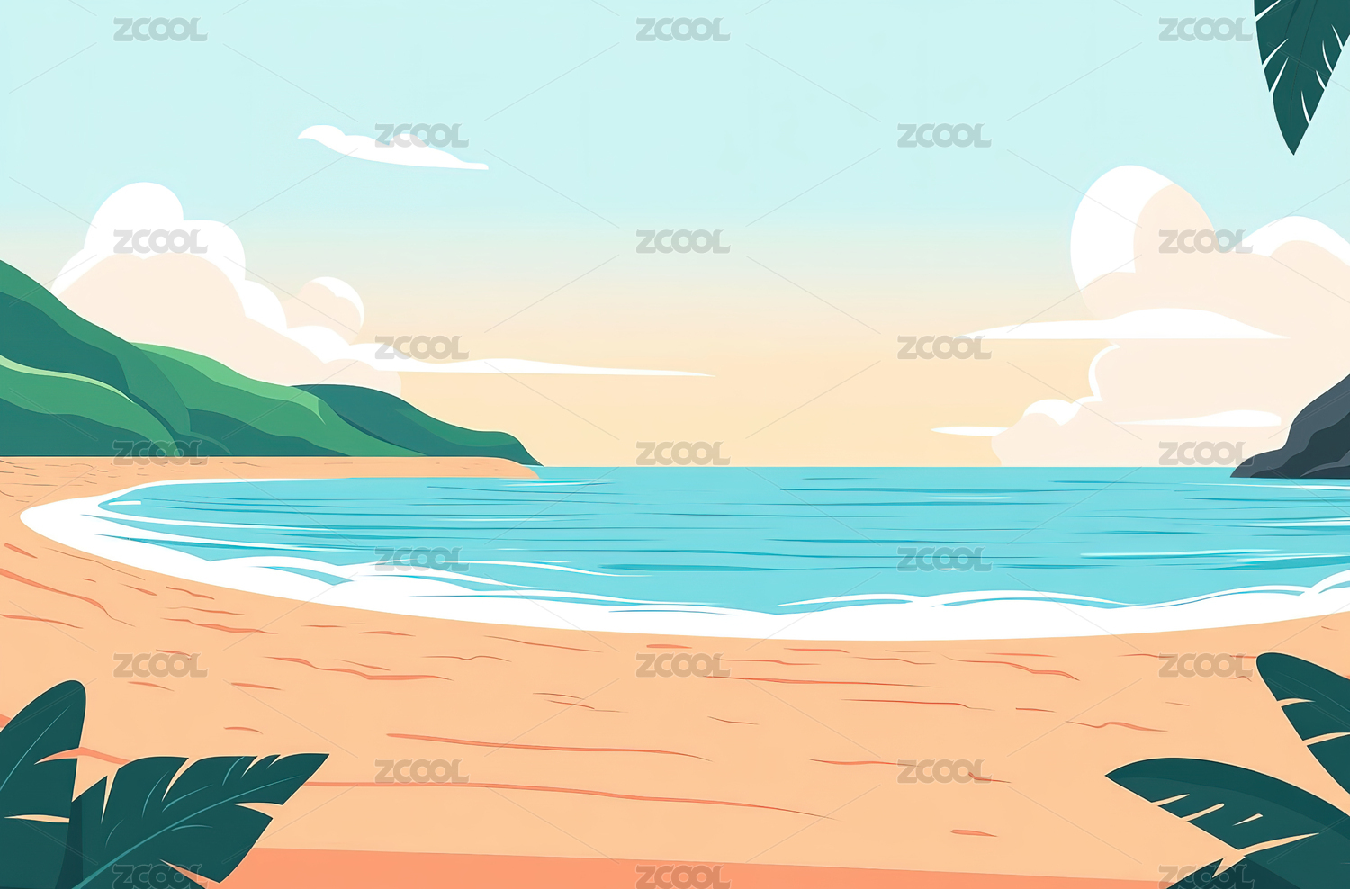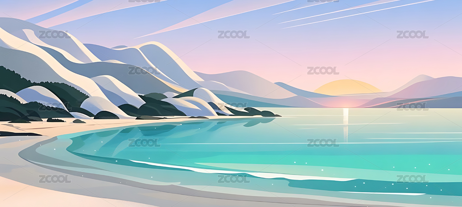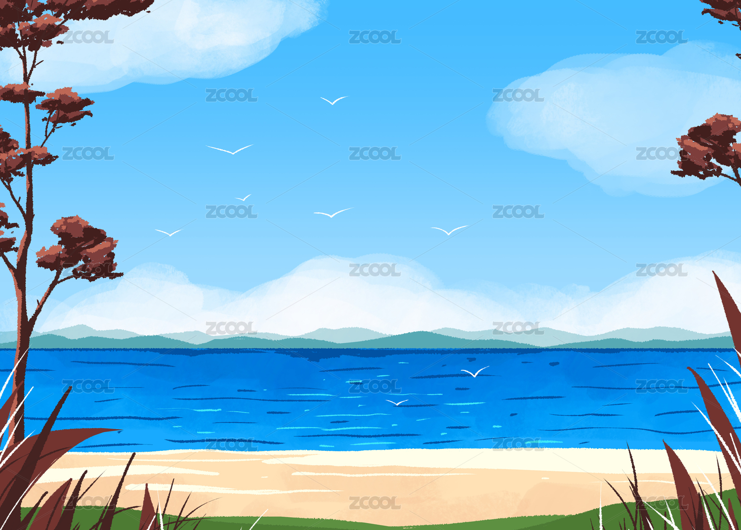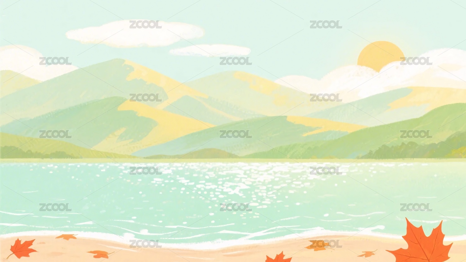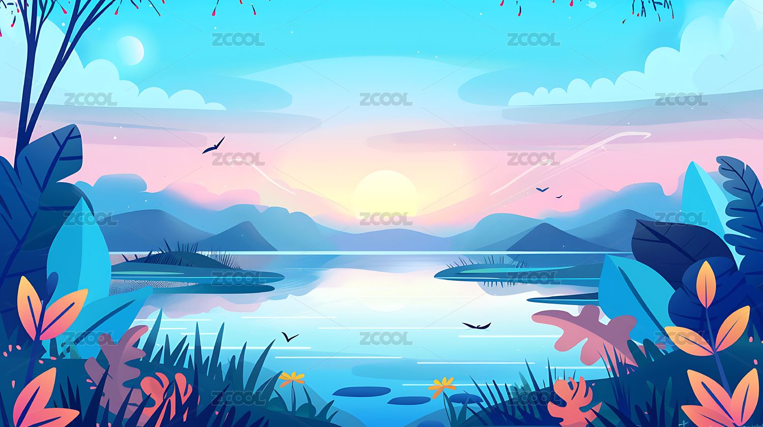 湖里有帆船的风景插画 各色植物的郊外山水风景插画