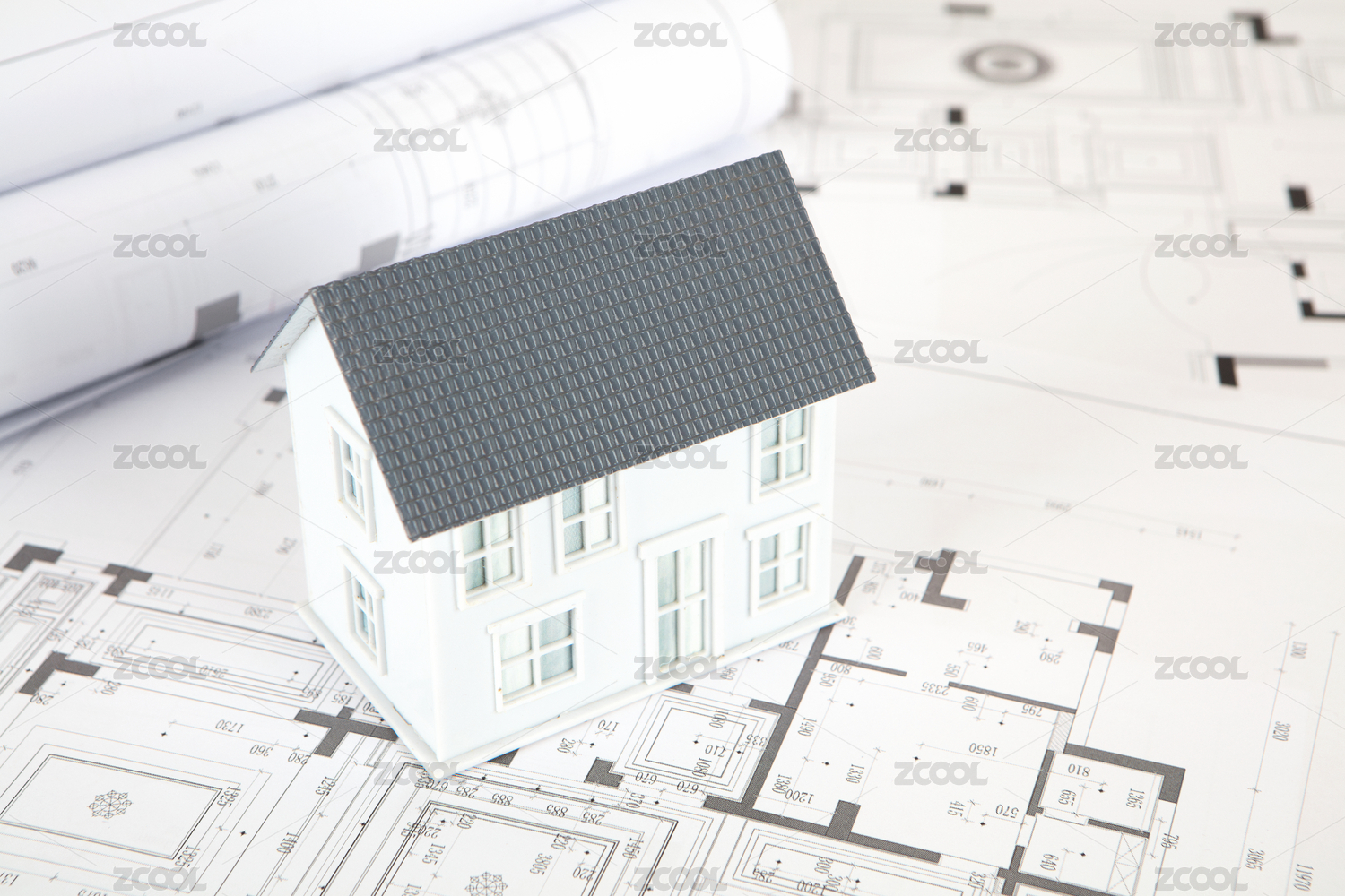 房屋装修设计相关的图纸和小房子模型及各种测绘工具