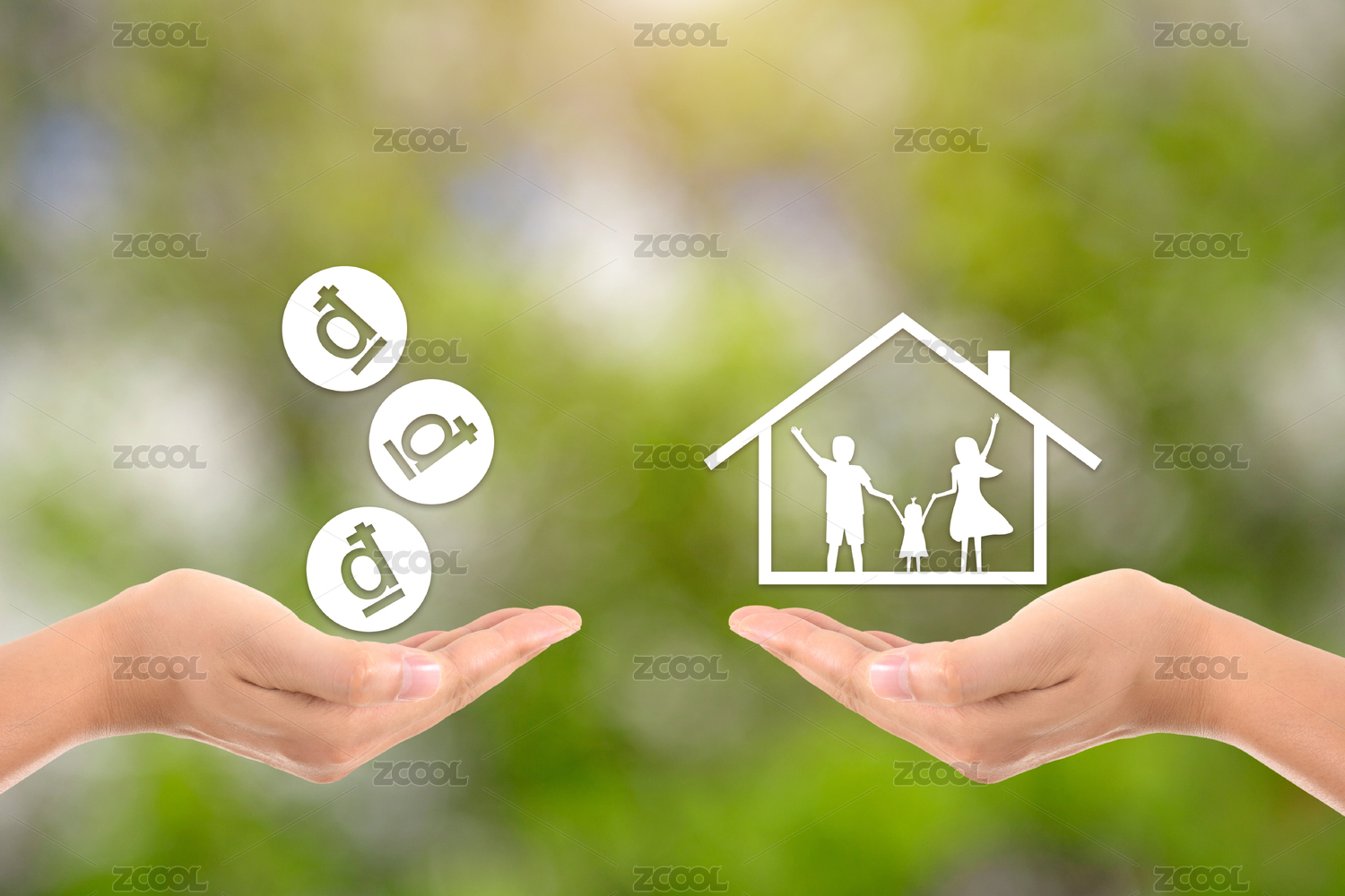 一只手托着虚拟的韩元硬币和另一只手托着装着一家三口的房子进行交易