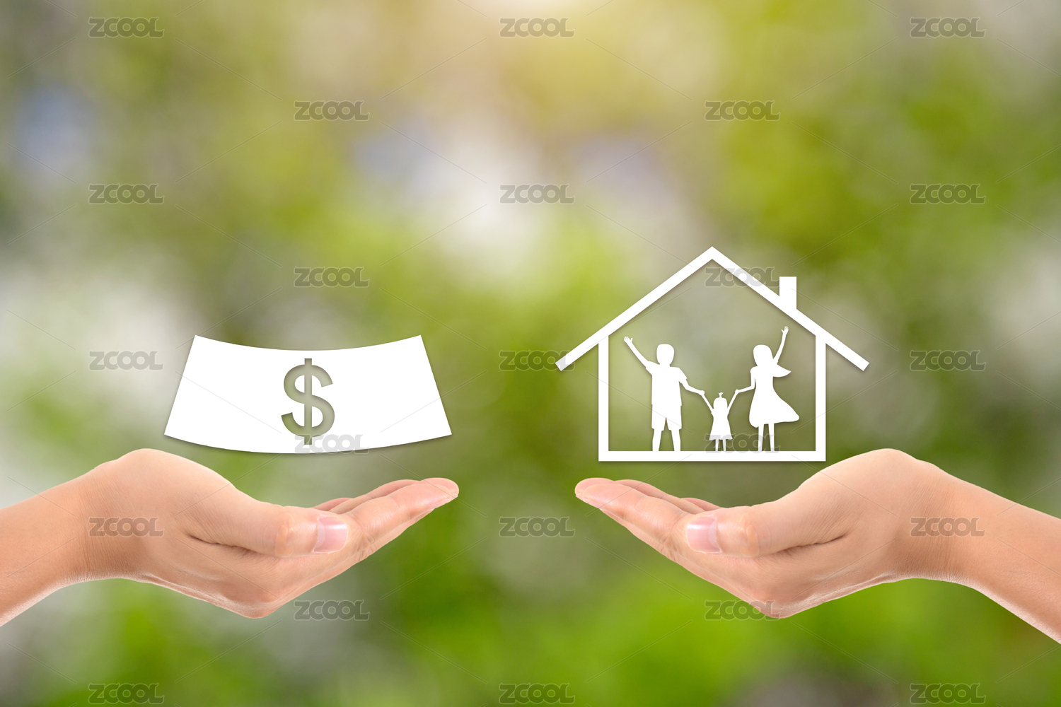 一只手托着虚拟的美元硬币和另一只手托着装着一家三口的房子进行交易