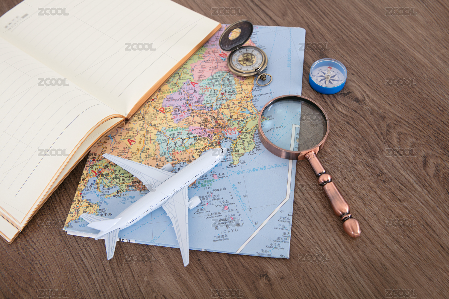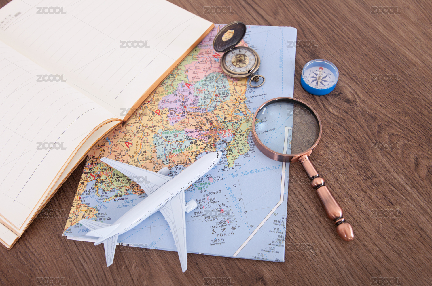 日本旅游地图和飞机模型及放大镜和其它相关出行工具
