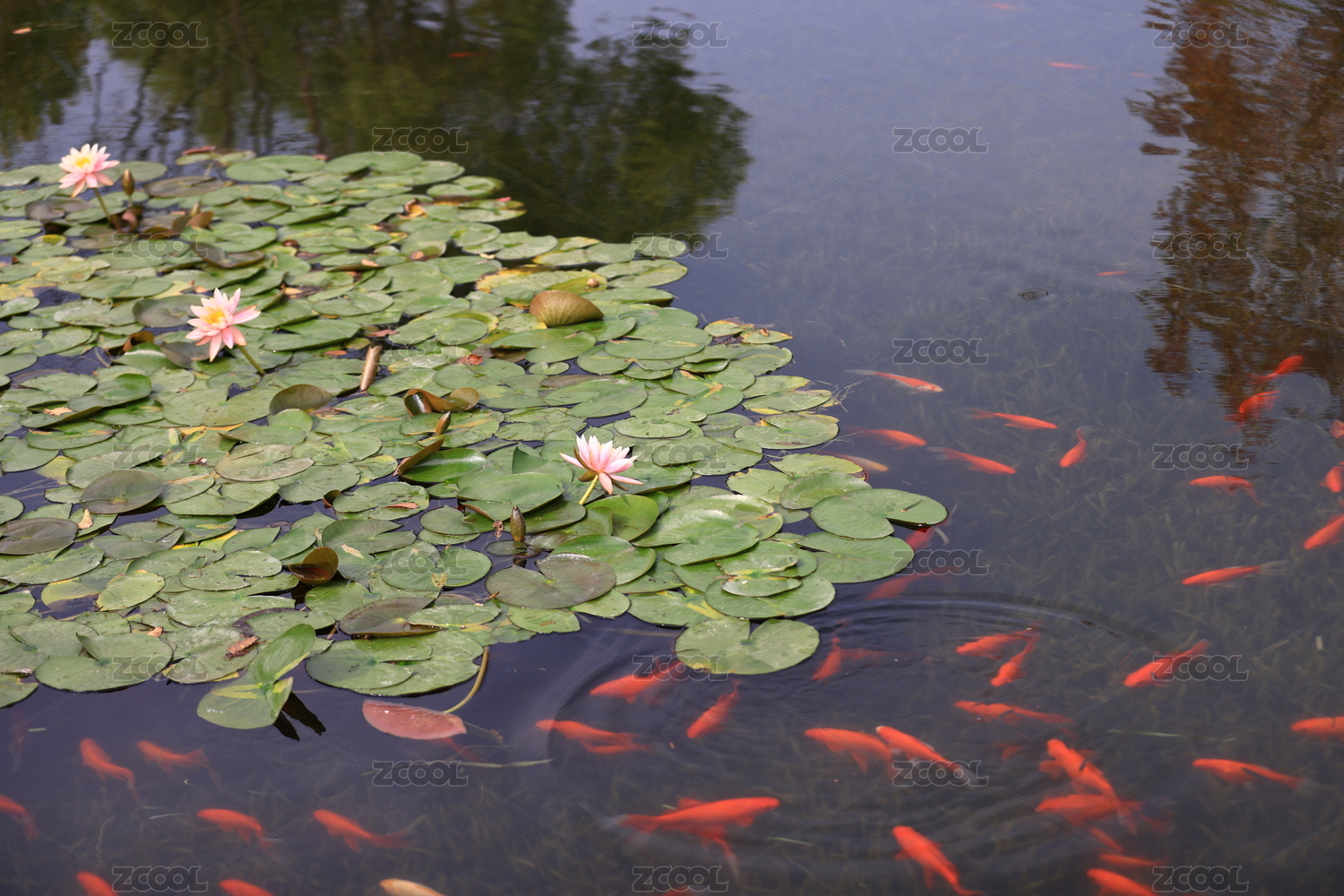 山西太原晋祠的池塘,金鱼游泳,荷叶花盛开