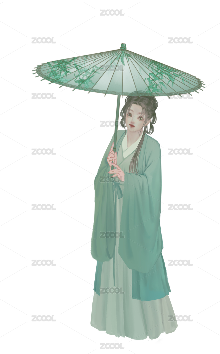 高视角俯视中式古风汉服古装女人打伞雨伞