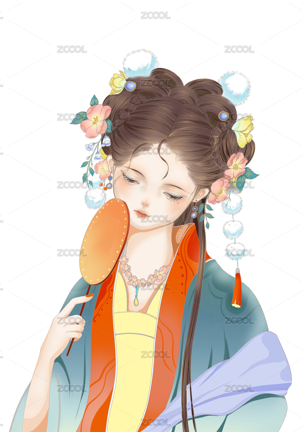 拿着团扇子坐姿坐着唐代古风汉服古装女人