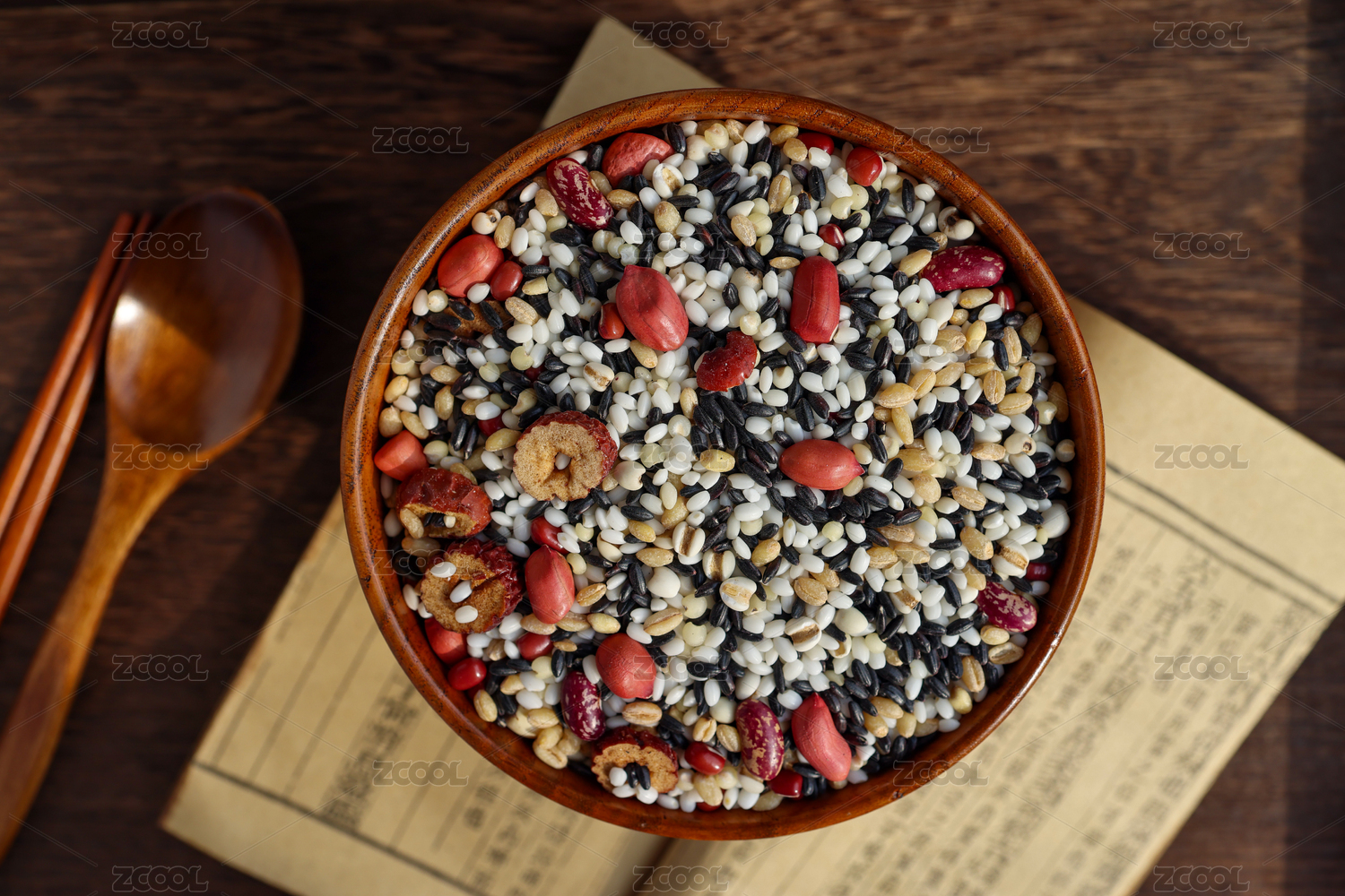 木桌背景五谷杂粮山药紫薯粥